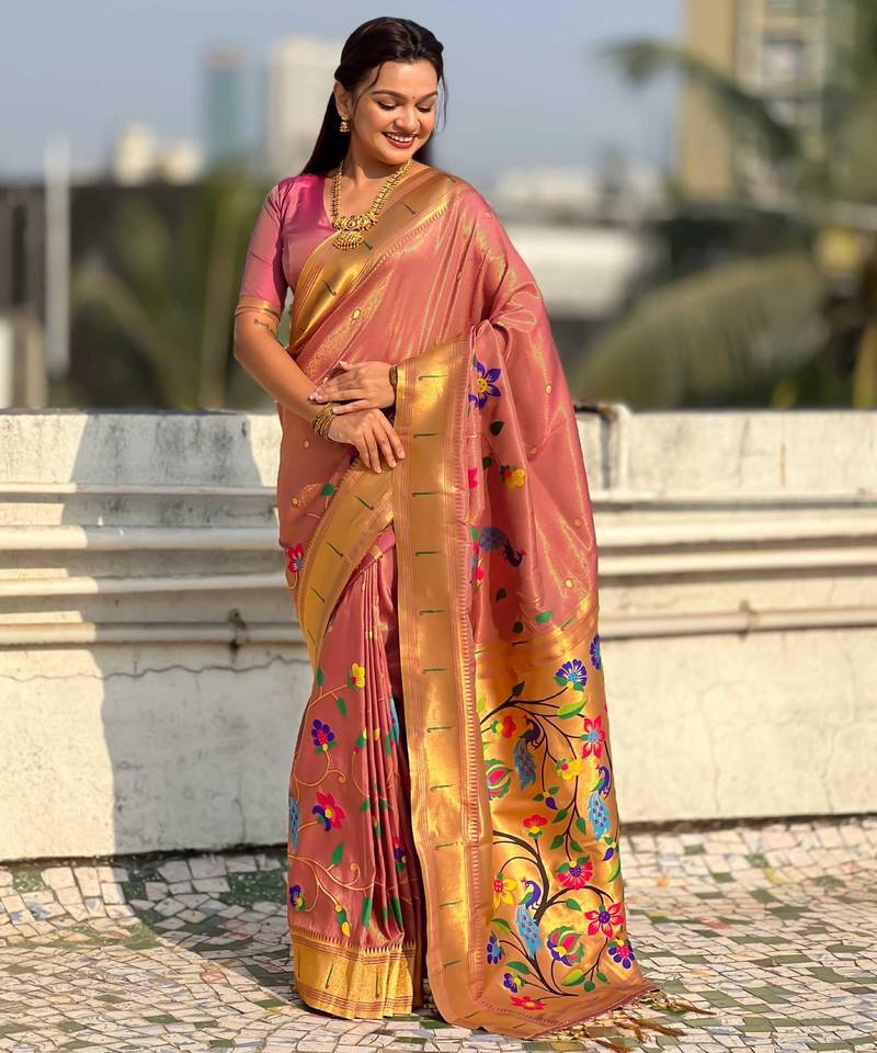 | Product Description | Elevate Your Ethnic Style With This Stunning Silk Blend Saree Featuring A Soft Enhanced With Vibrant Multicolor Floral Weaving And A Rich Zari Border. Inspired By Traditional Paithani Design, This Saree Beautifully Combines Elegance With Artistic Craftsmanship. The Smooth Texture And Graceful Drape Make It Ideal For Weddings, Festive Occasions, And Special Celebrations. Designed For Women Who Appreciate Classic Yet Stylish Ethnic Wear, This Saree Adds Charm And Sophistication To Your Look. Pair It With Statement Jewelry And Heels To Create A Graceful And Eye Catching Appearance That Reflects Timeless Beauty And Cultural Richness. |