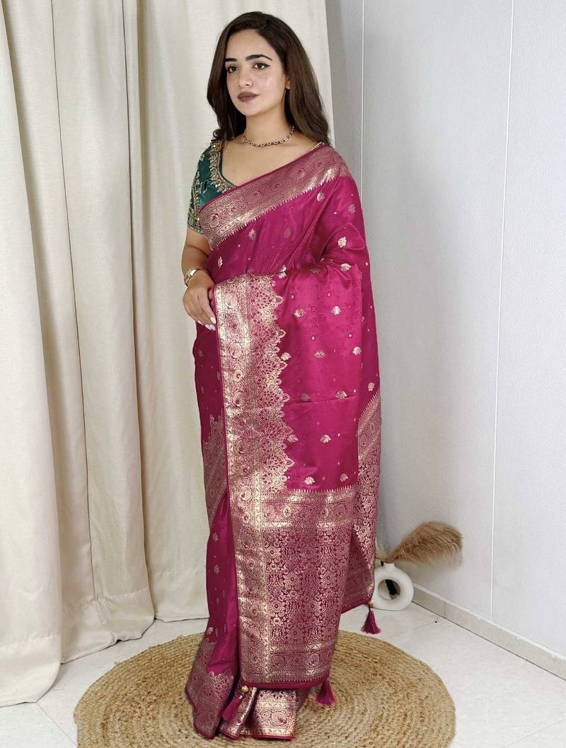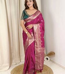 Magenta banarasi satin silk zari weaving saree with embroiderd blouse piece