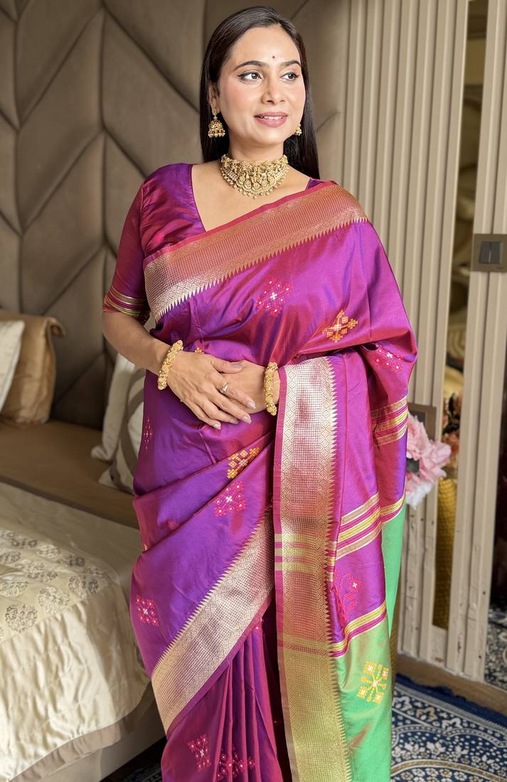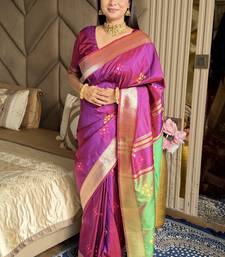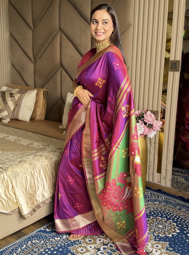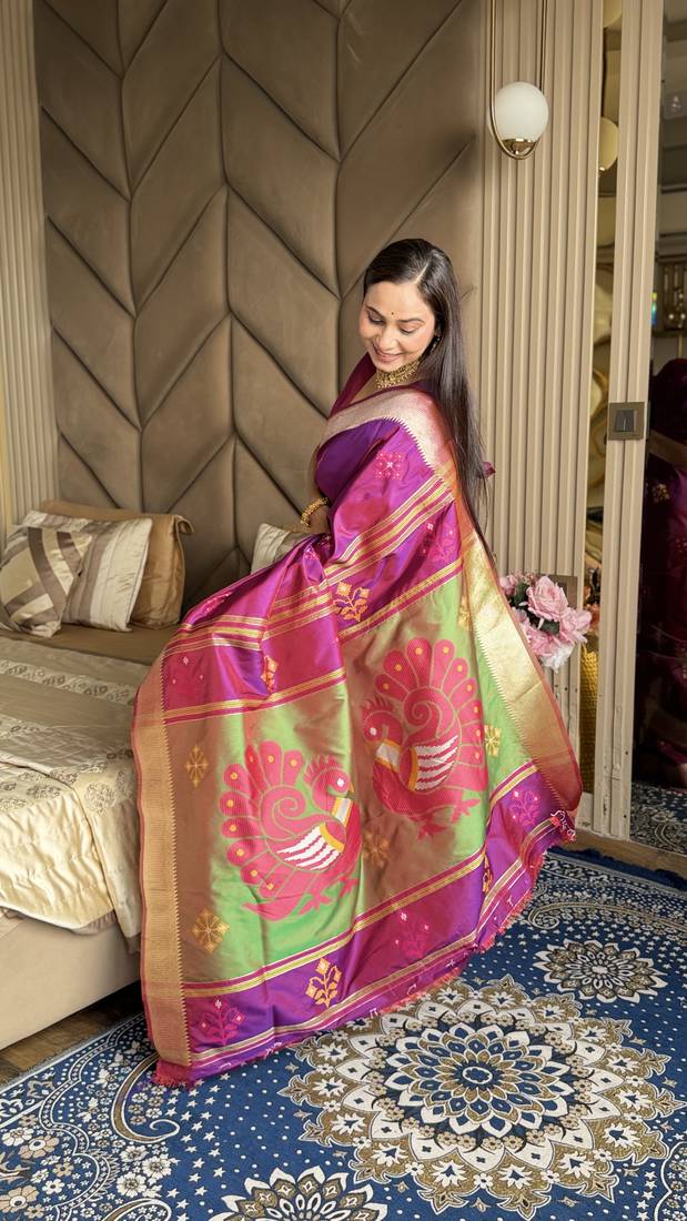 Magenta woven zari buti & peacock pallu work silk blend fabric traditional festive style paithani style saree