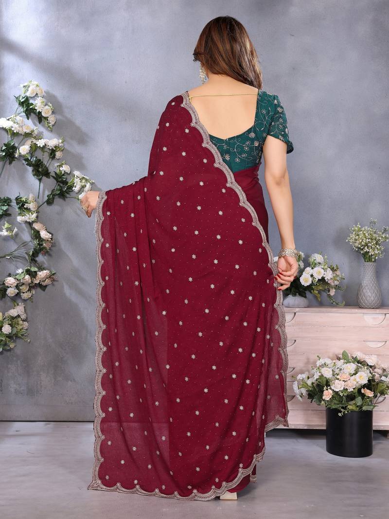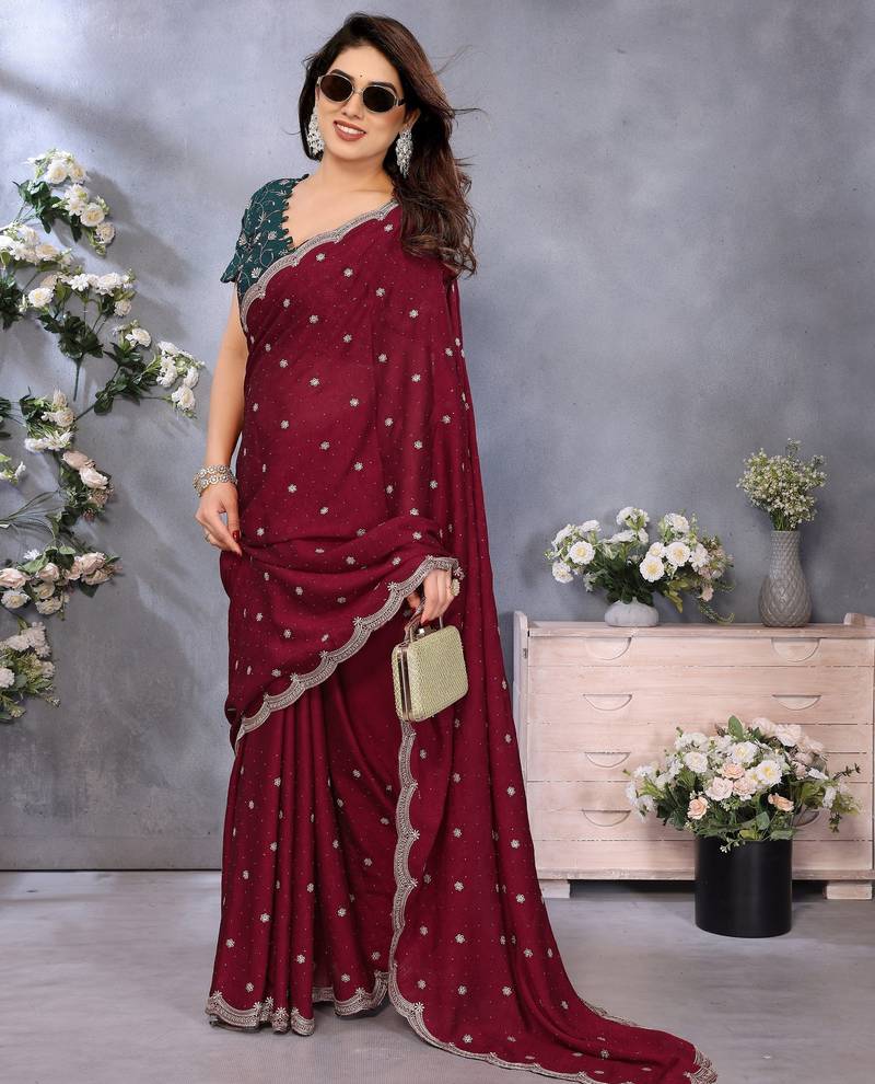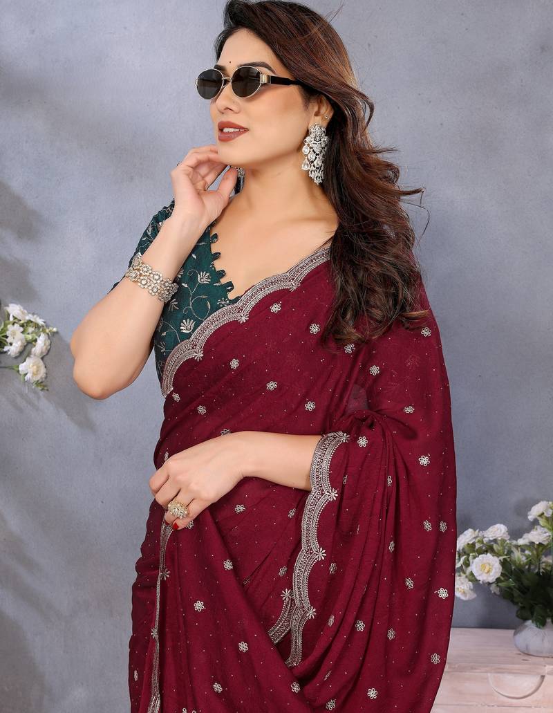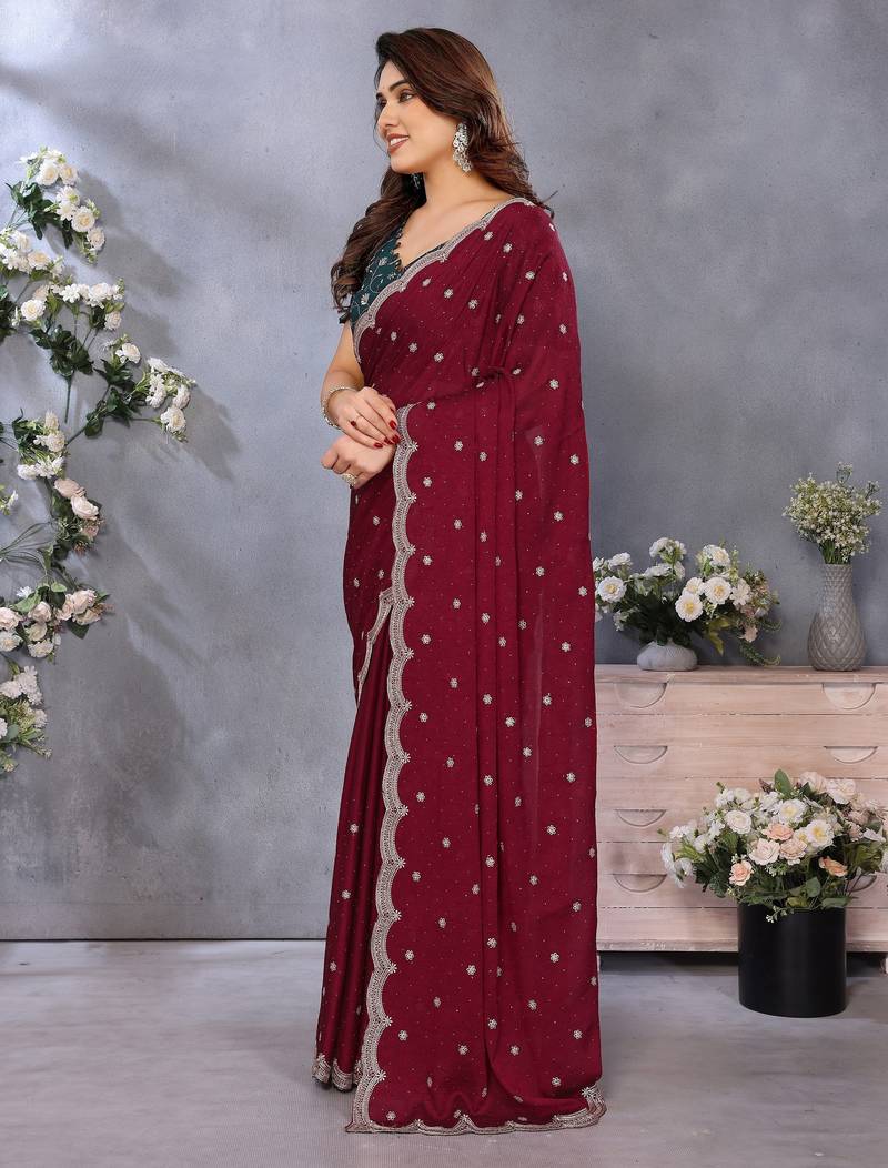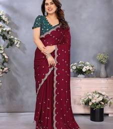 Maroon soft silk crush saree with sequence embroidery work and contrast blouse piece