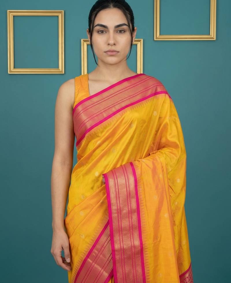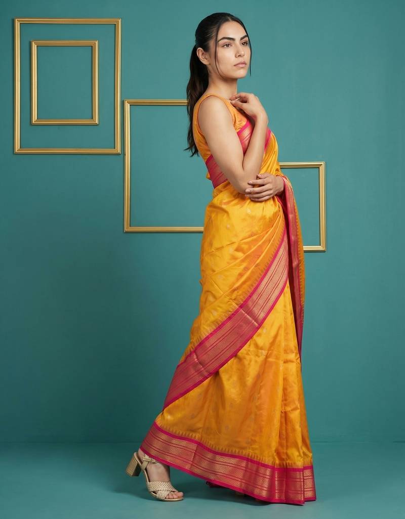 Mustard border woven zari border & buti work silk blend fabric traditional festive style