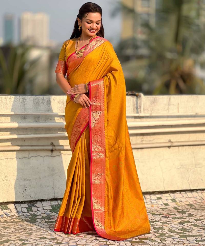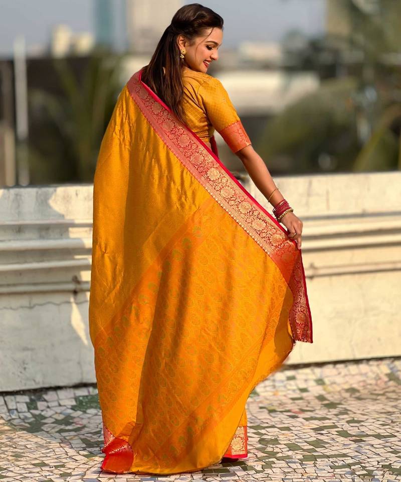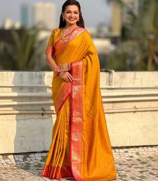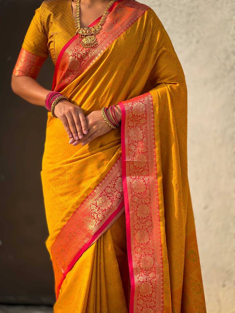 | Product Name | Mustard Contrast Woven Zari Floral Border & Pallu Work Silk Blend | |