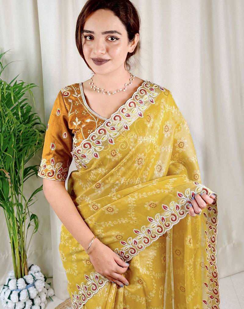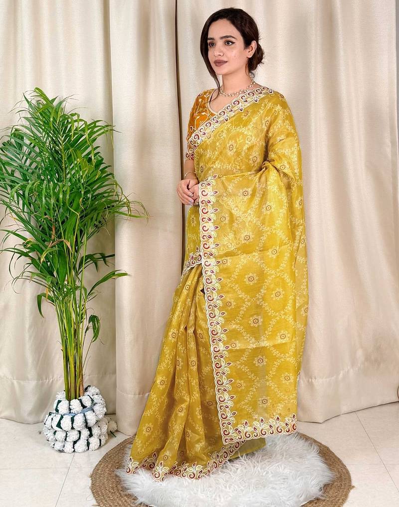 | Product Name | Mustard Cotton Satin Weaving Zari Border Embroiderd Saree With Matching Blouse Piece | |
