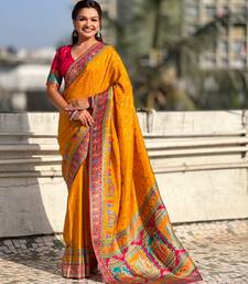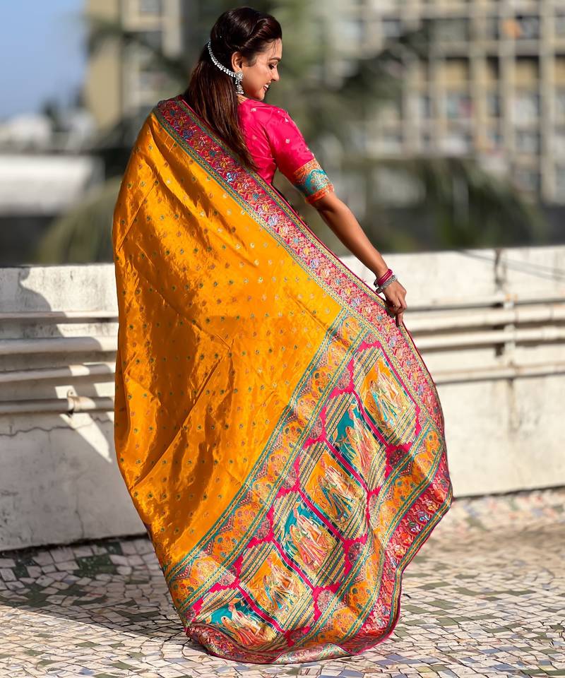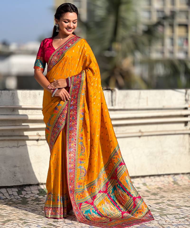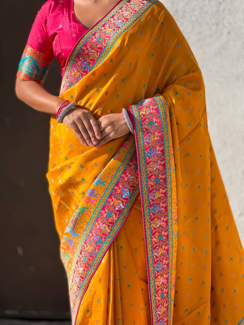 Mustard silk blend saree with traditional multicolor woven border & rich pallu | festive & party wear saree