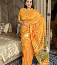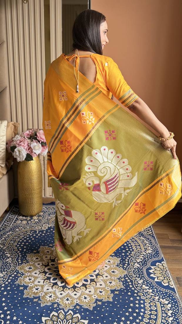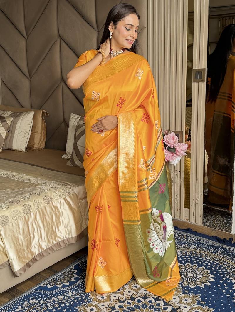 Mustard woven zari buti & peacock pallu work silk blend fabric traditional festive style paithani style saree