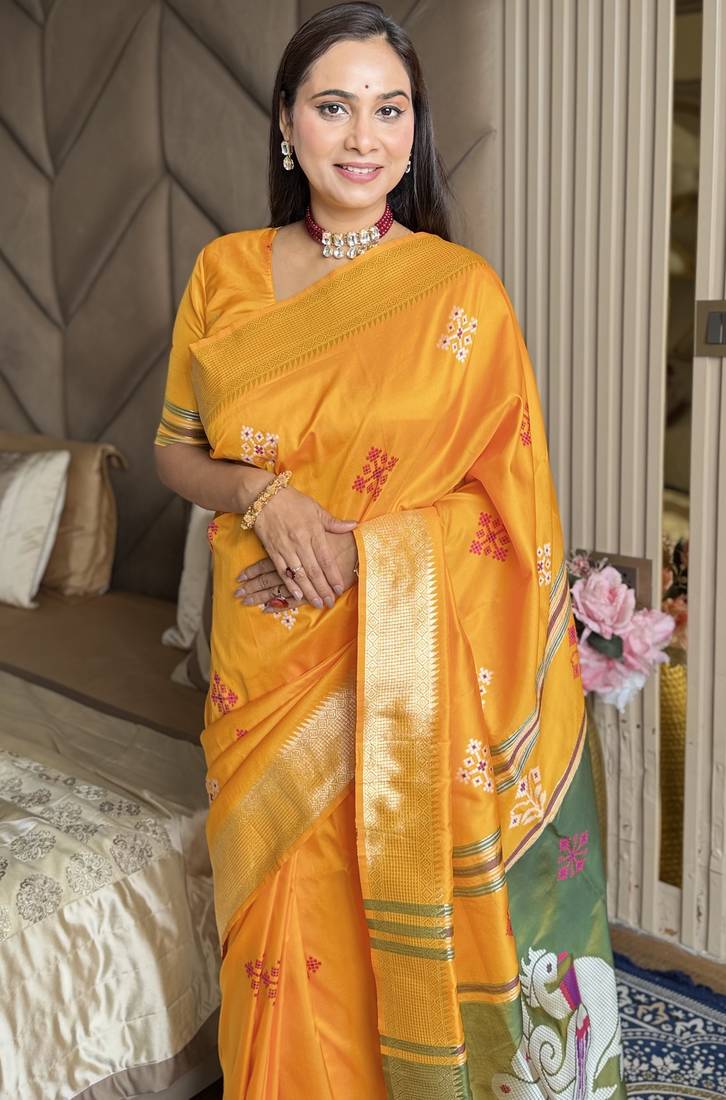 | Product Name | Mustard Woven Zari Buti & Peacock Pallu Work Silk Blend Fabric Traditional Festive Style Paithani Style Saree | |