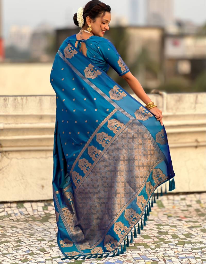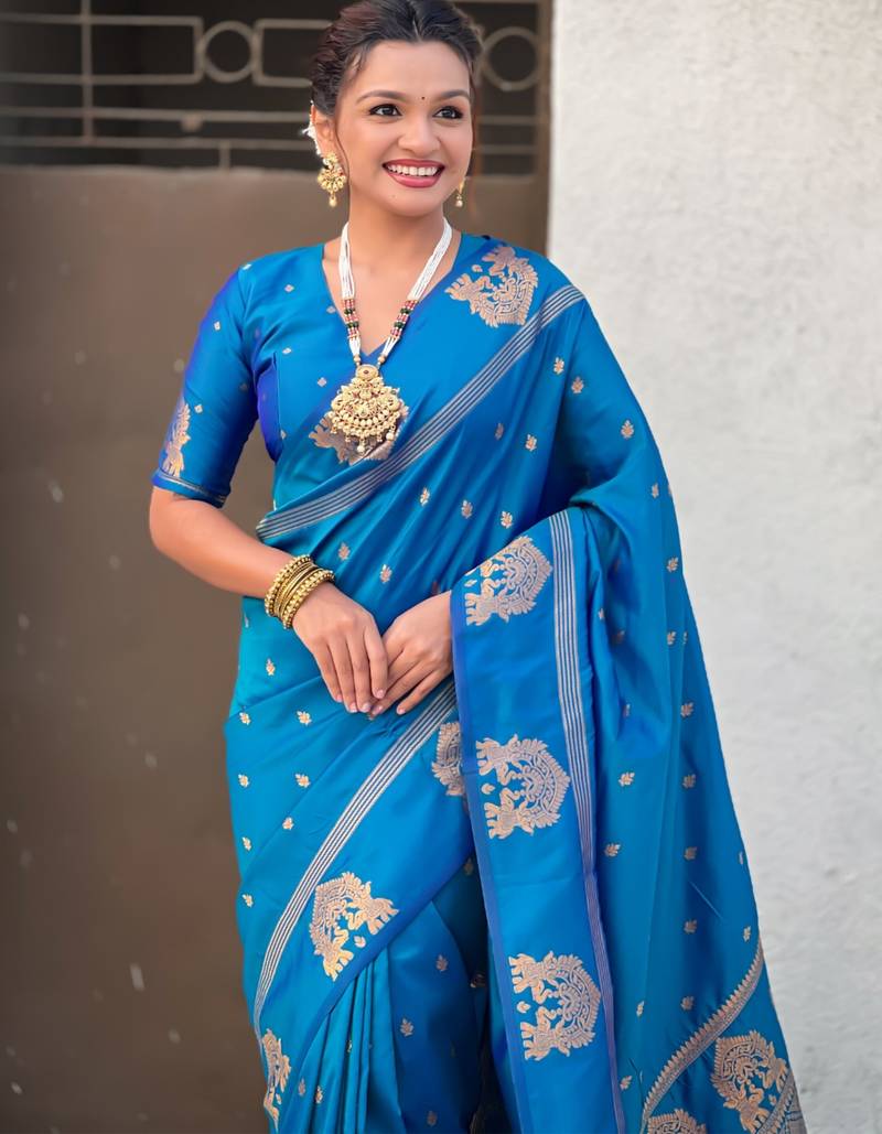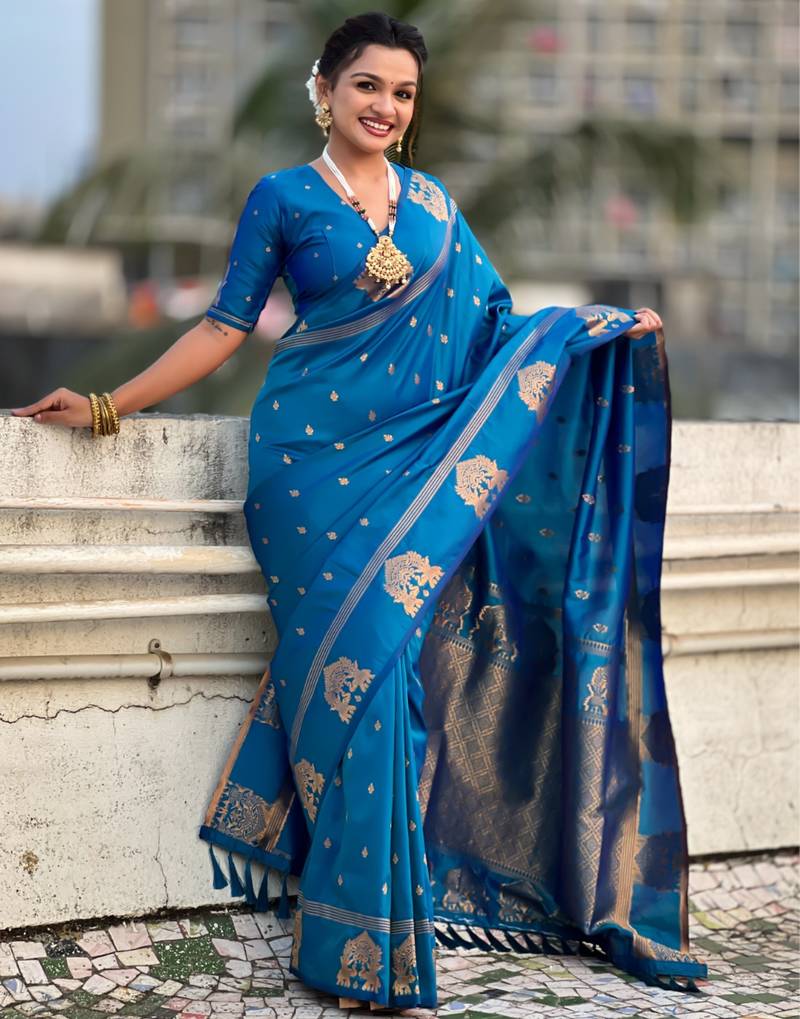 | Product Name | Navy Blue Silk Blend Saree With Golden Zari Motifs & Rina Woven Pallu | Tnaditional Festive Wear Saree | |