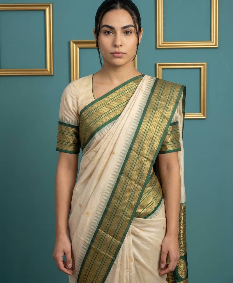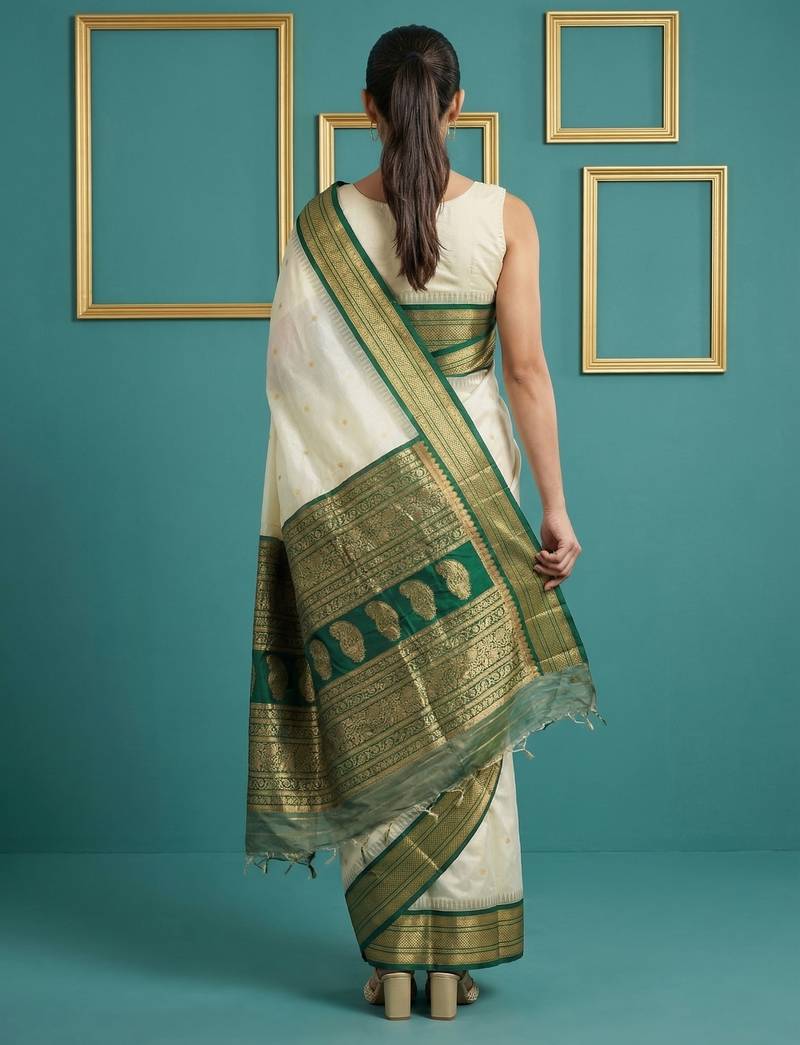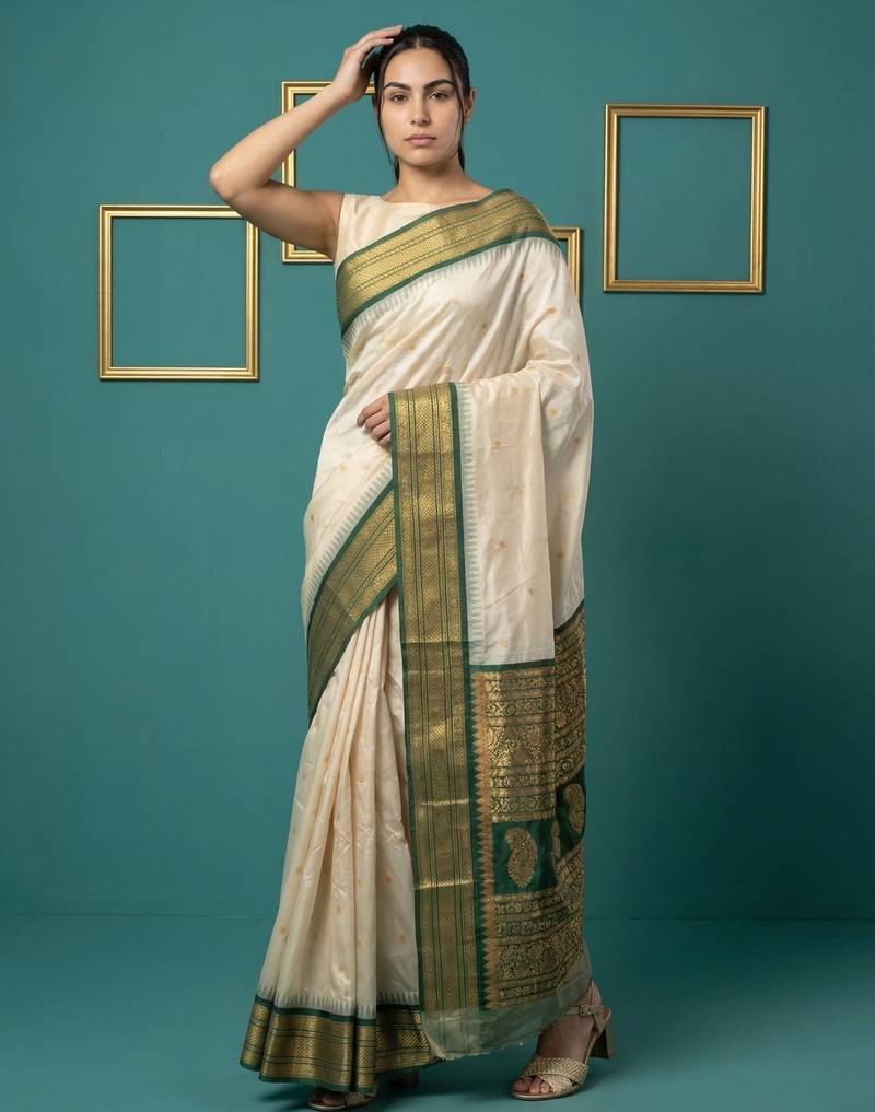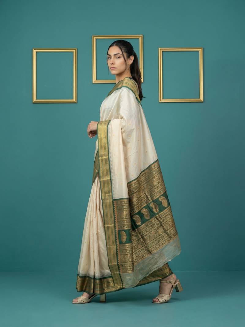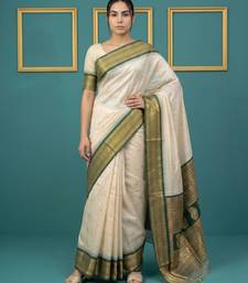 Off white border woven zari border & buti work silk blend fabric traditional festive style
