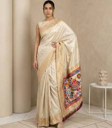 Off white pallu woven zari buti & traditional motifs work silk blend fabric traditional festive style