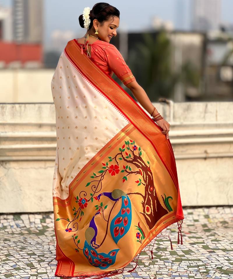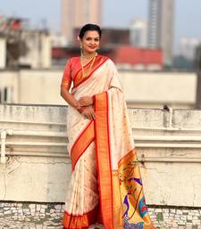 Off-white silk blend saree with orange zari border & peacock printed pallu | festive traditional wear saree