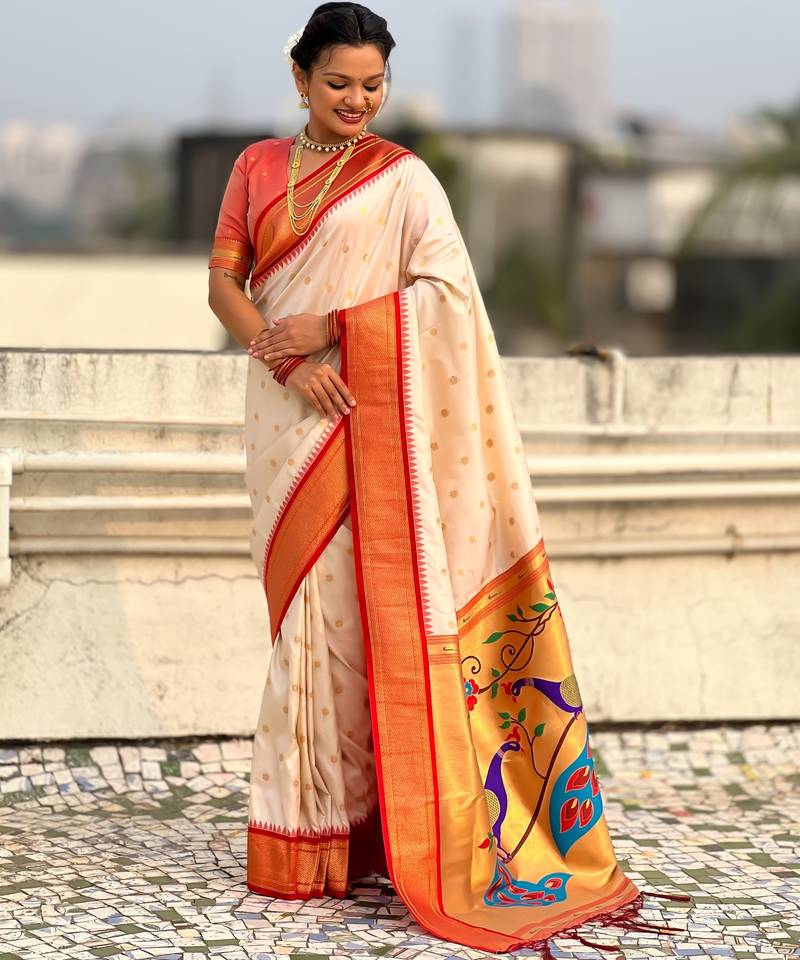 | Product Name | Off White Silk Blend Saree With Orange Zari Border & Peacock Printed Pallu | Festive Traditional Wear Saree | |