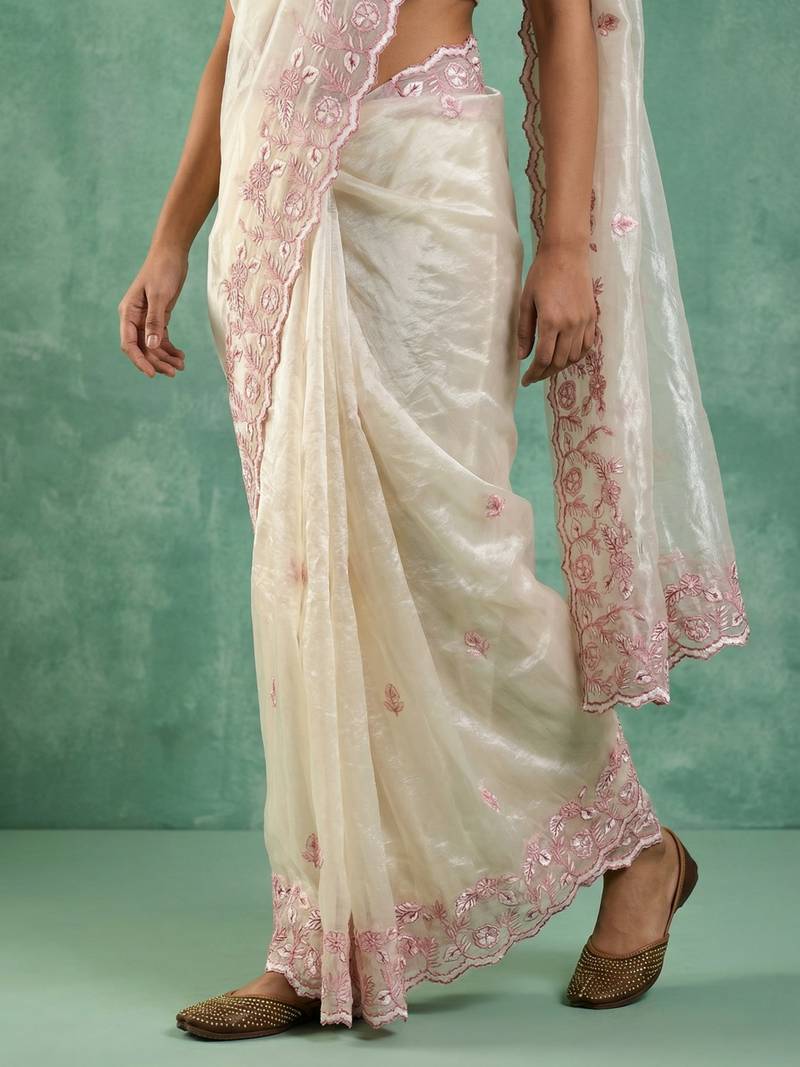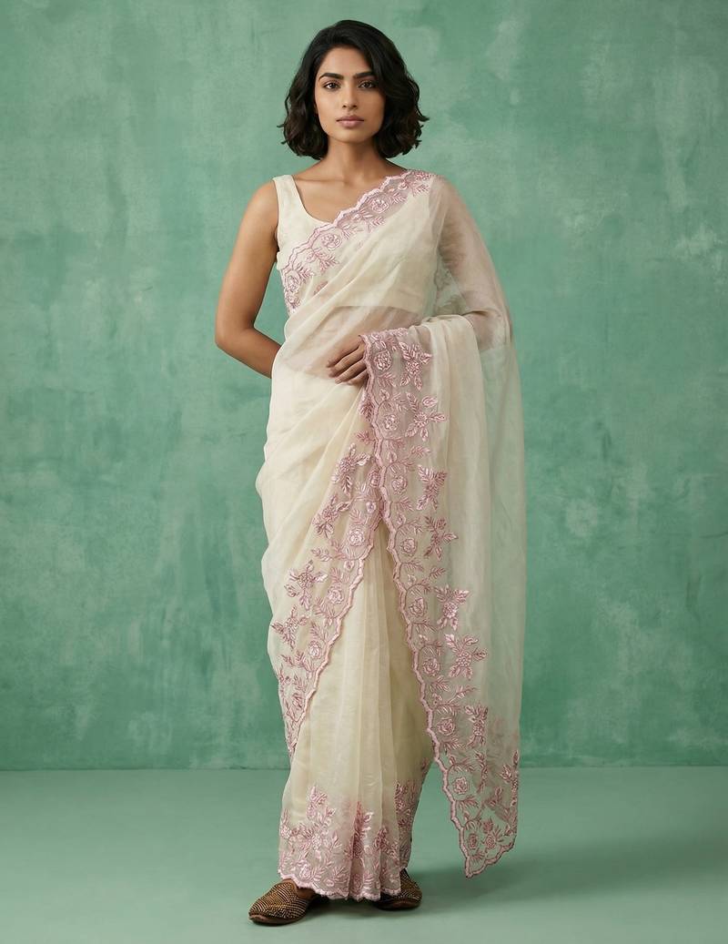 | Product Description | This Elegant Off White Saree Is Crafted From Lightweight Organza Fabric, Offering A Sheer Texture With A Graceful And Flowy Drape. It Features Delicate Pink Floral Embroidery Along The Border And Pallu, Adding A Soft And Sophisticated Charm. The Intricate Thread Work Enhances Its Refined And Minimalistic Appeal, Making It Perfect For Day Events, Parties, And Festive Occasions. The Subtle Elegance Of This Saree Gives A Classy And Modern Ethnic Look. It Comes With A Matching Blouse Piece To Complete A Stylish And Graceful Ensemble. |