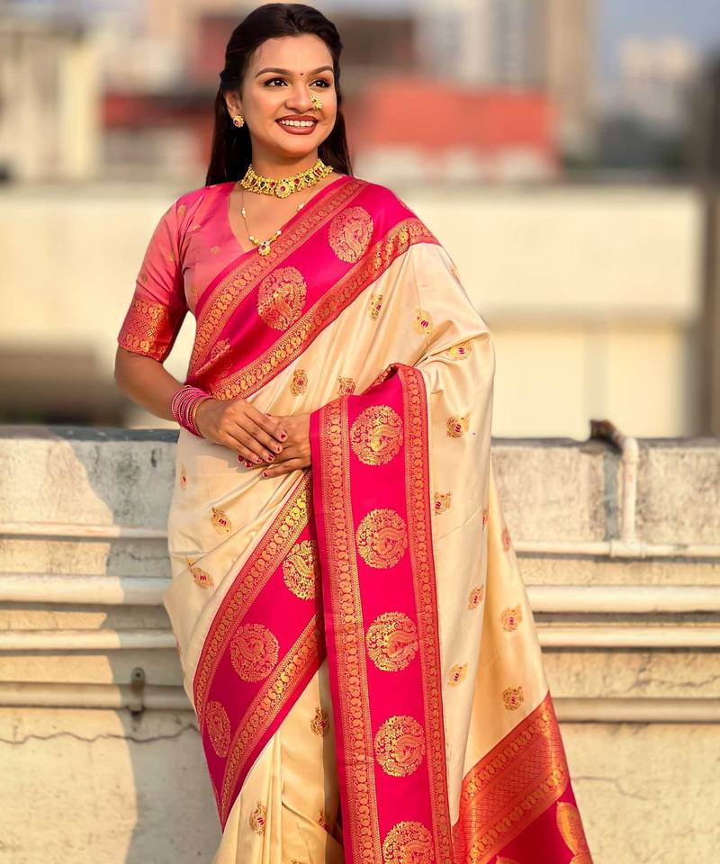 | Product Description | This Stunning Saree Is Crafted From Premium Silk Blend Fabric, Offering A Rich Texture With A Smooth And Elegant Drape. It Features Intricate Zari Woven Motifs Across The Body, Complemented By A Bold Contrast Border And Pallu That Enhance Its Traditional Appeal. The Detailed Zari Work Adds A Regal And Festive Charm, Making It Perfect For Weddings, Celebrations, And Cultural Occasions. Paired With A Matching Blouse Piece, This Saree Creates A Graceful And Eye Catching Ethnic Look With Timeless Elegance. |
