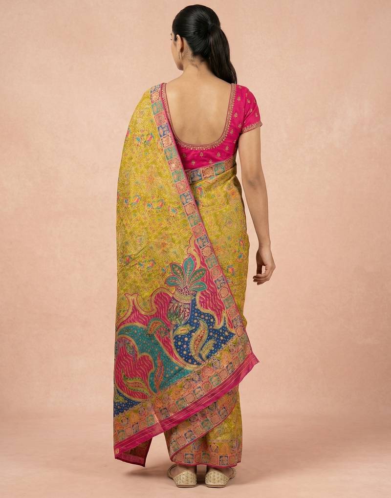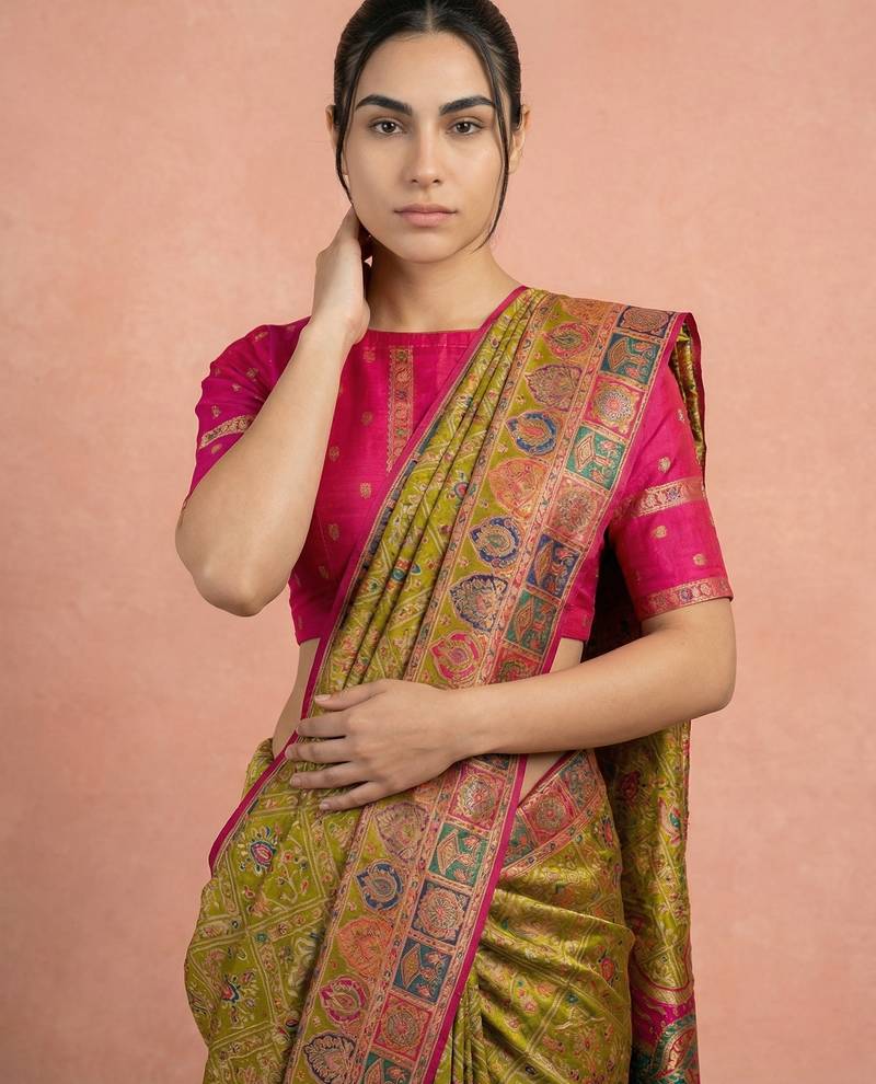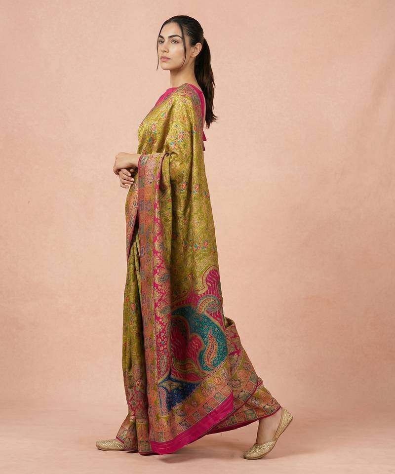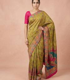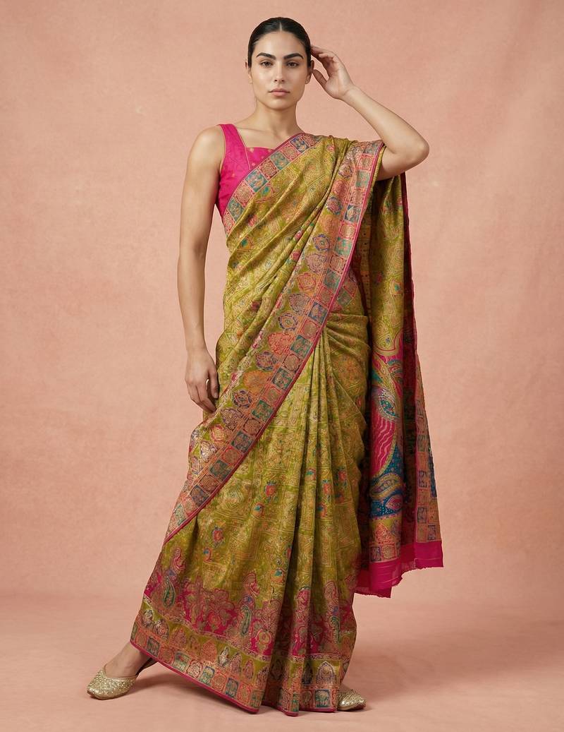 Olive printed silk blend saree with multicolor traditional border & paisley pallu | festive ethnic wear saree