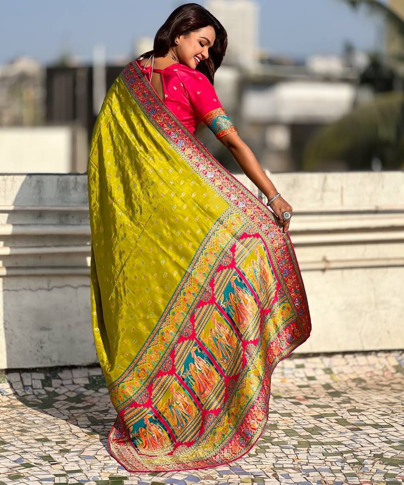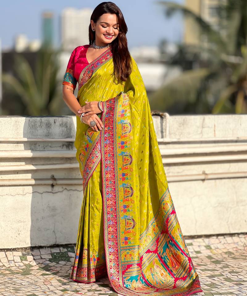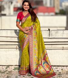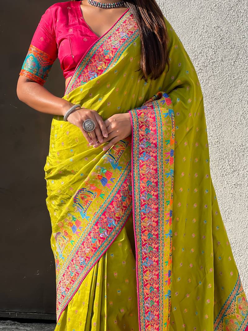 Olive silk blend saree with traditional multicolor woven border & rich pallu | festive & party wear saree