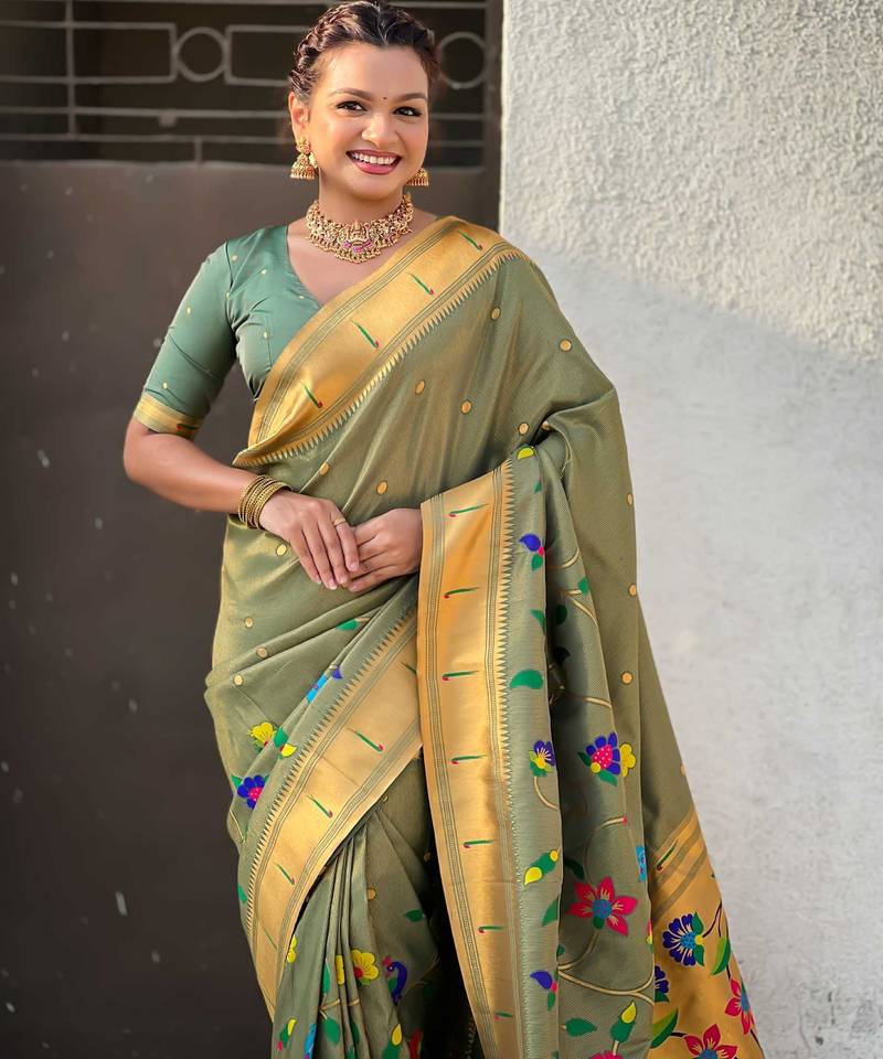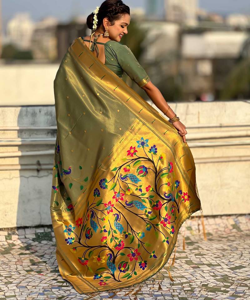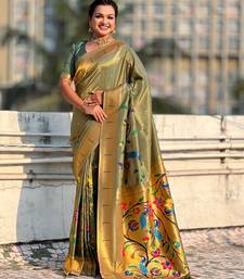 Olive with multicolor accents woven zari floral & peacock motifs silk blend