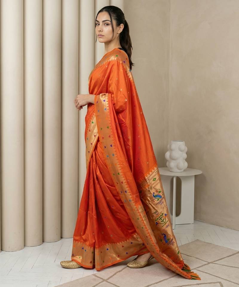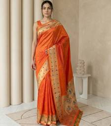Orange with gold border contrast traditional peacock & triangle motifs work silk blend fabric rich ethnic festive wear