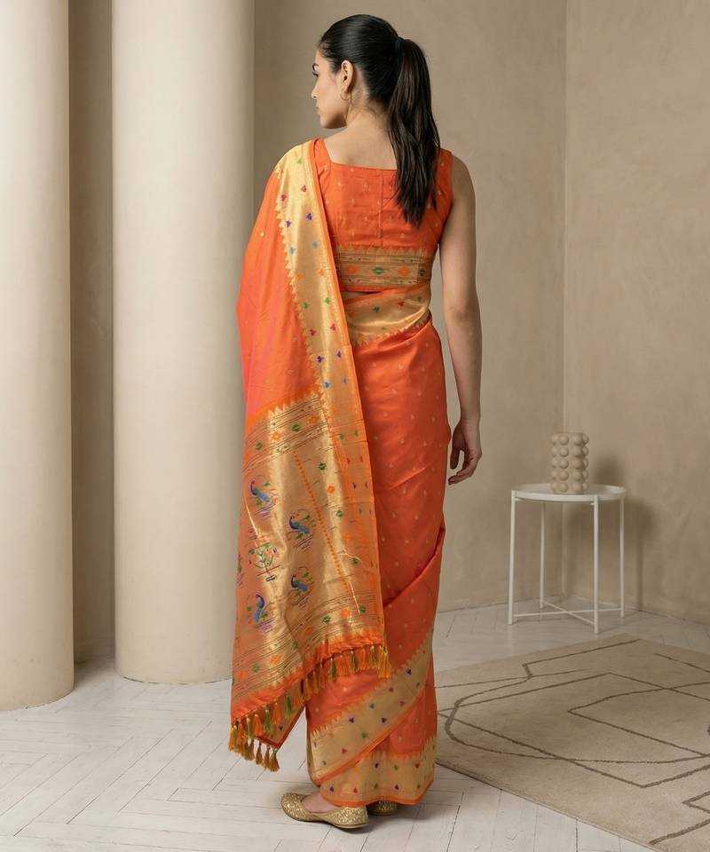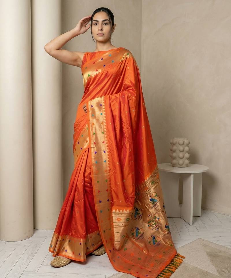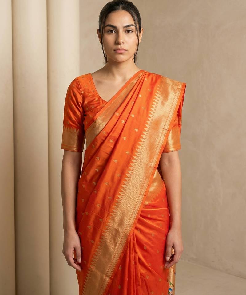 | Product Name | Orange With Gold Border Contrast Traditional Peacock & Triangle Motifs Work Silk Blend Fabric Rich Ethnic Festive Wear | |