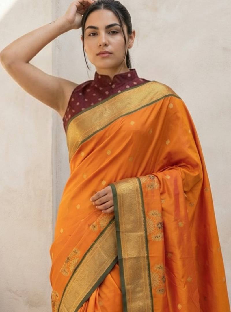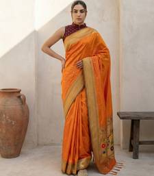 Orange woven zari buti & floral motifs work silk blend fabric traditional festive style