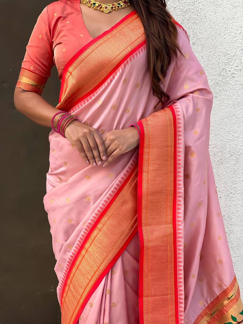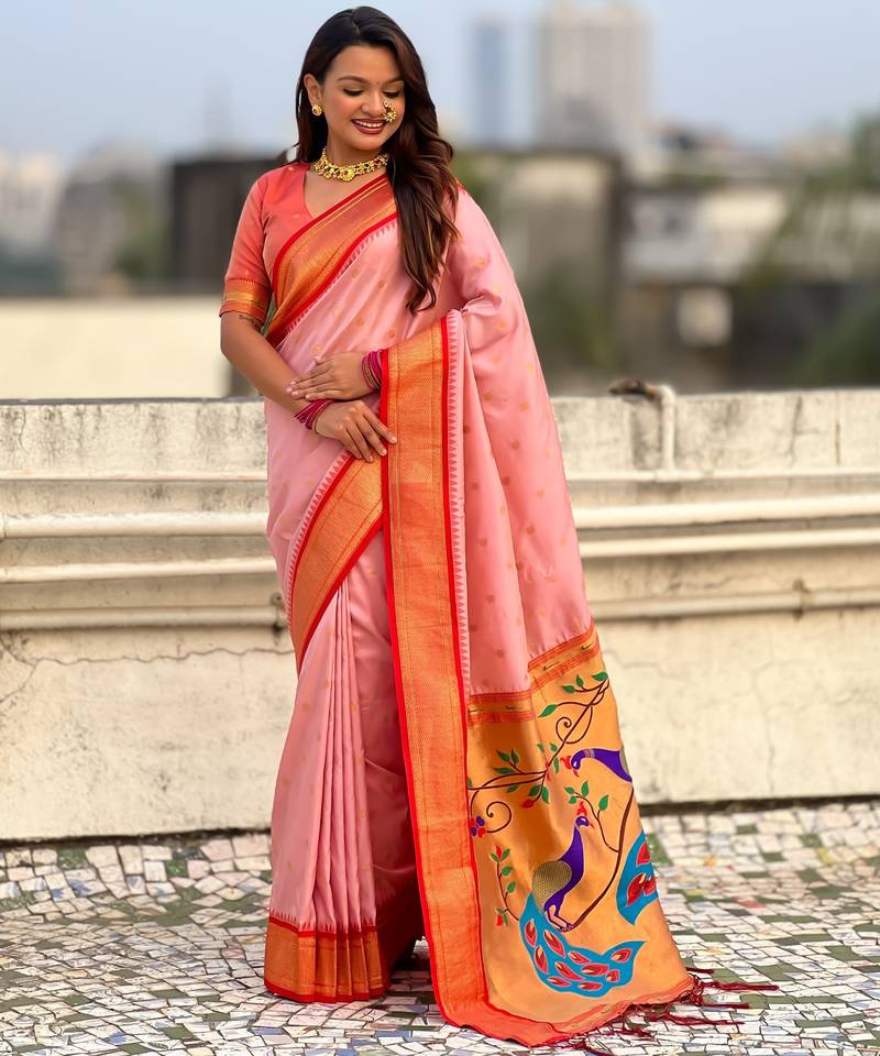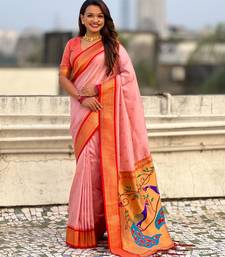 | Product Name | Peach Peach Silk Blend Saree With Orange Zari Border & Peacock Printed Pallu | Festive Traditional Wear Saree | |