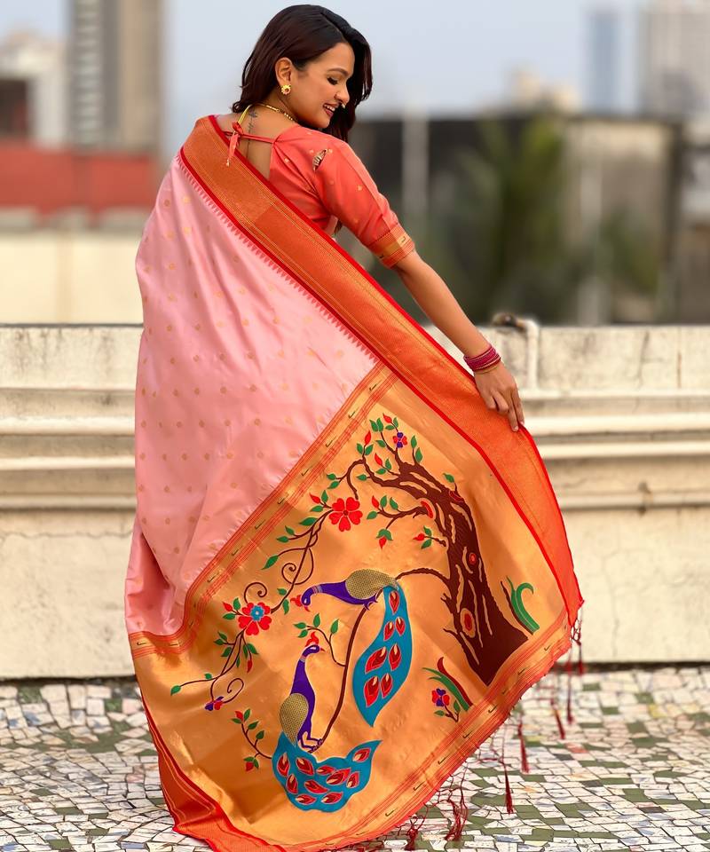 Peach-peach silk blend saree with orange zari border & peacock printed pallu | festive traditional wear saree