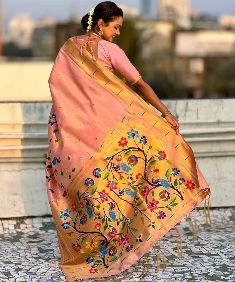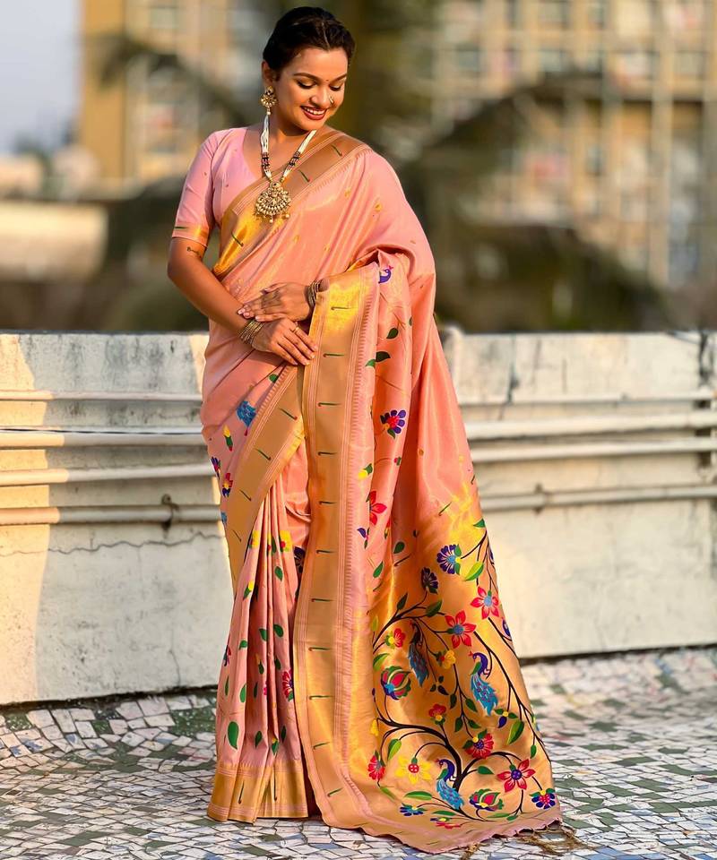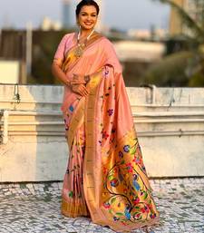 Peach with multicolor accents woven zari floral & peacock motifs silk blend