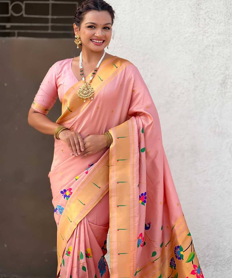 | Product Description | Elevate Your Ethnic Style With This Stunning Silk Blend Saree Featuring A Soft Enhanced With Vibrant Multicolor Floral Weaving And A Rich Zari Border. Inspired By Traditional Paithani Design, This Saree Beautifully Combines Elegance With Artistic Craftsmanship. The Smooth Texture And Graceful Drape Make It Ideal For Weddings, Festive Occasions, And Special Celebrations. Designed For Women Who Appreciate Classic Yet Stylish Ethnic Wear, This Saree Adds Charm And Sophistication To Your Look. Pair It With Statement Jewelry And Heels To Create A Graceful And Eye Catching Appearance That Reflects Timeless Beauty And Cultural Richness. |