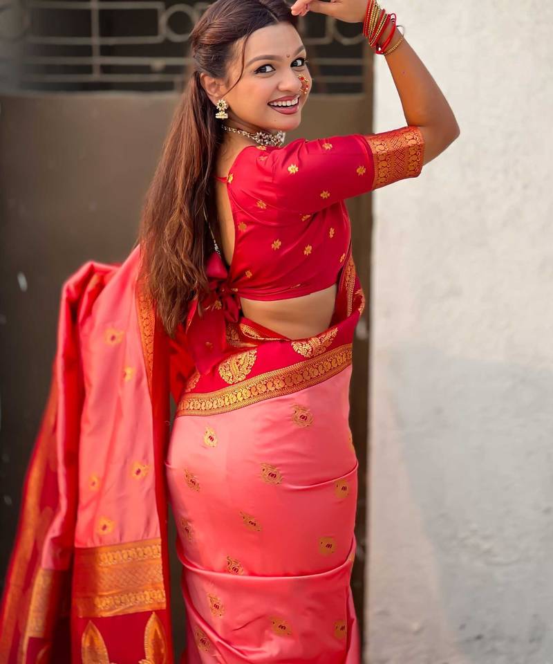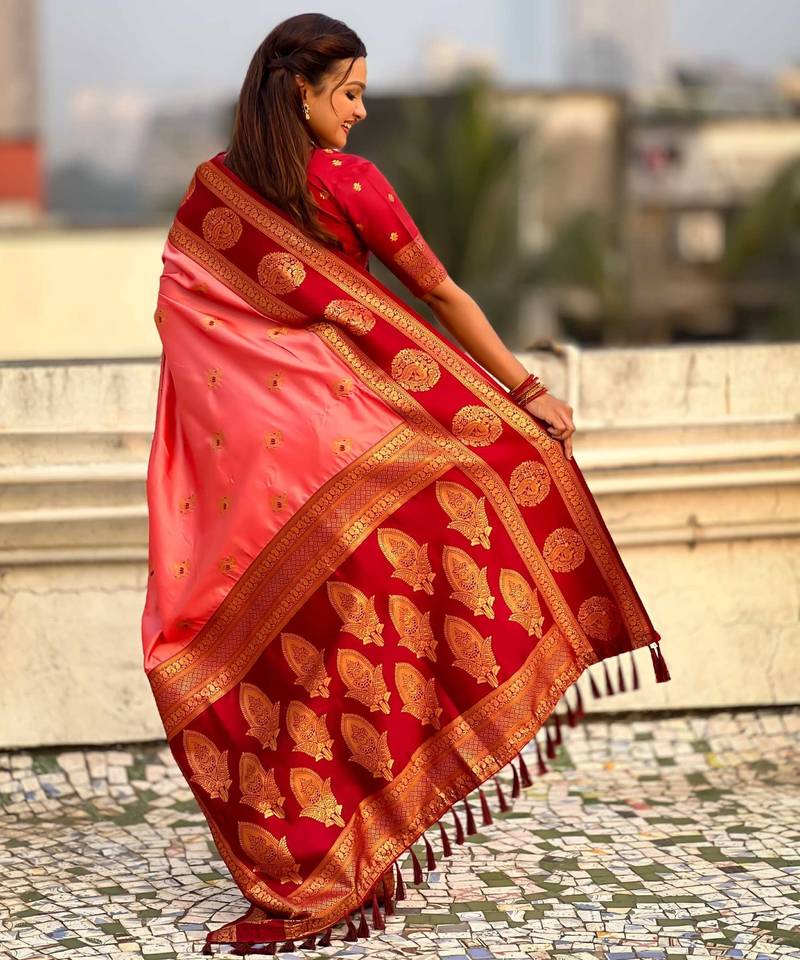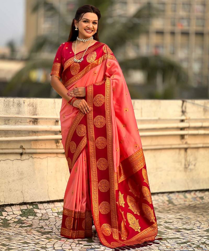 | Product Name | Peach Woven Zari Traditional Motifs Work Silk Blend | |