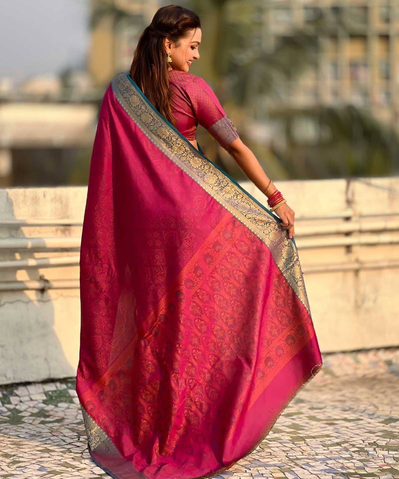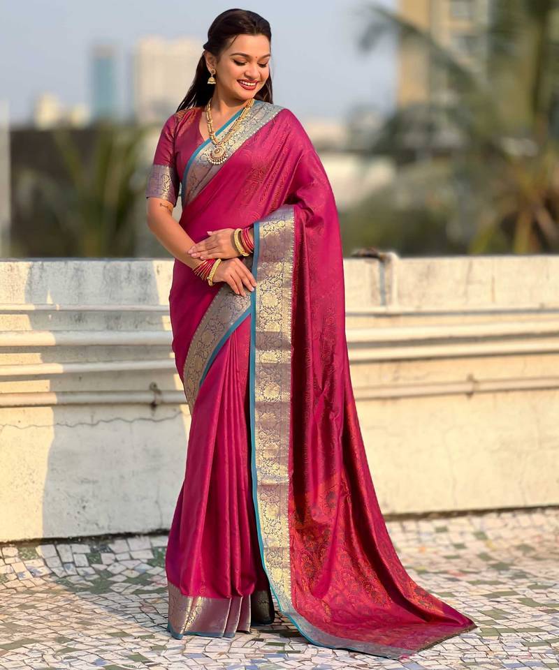 | Product Name | Pink Contrast Woven Zari Floral Border & Pallu Work Silk Blend | |