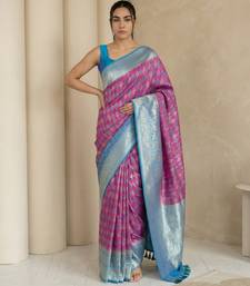 Pink geometric diamond weave pattern rich zari woven border & pallu silk blend fabric elegant festive & traditional wear