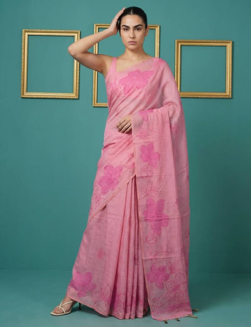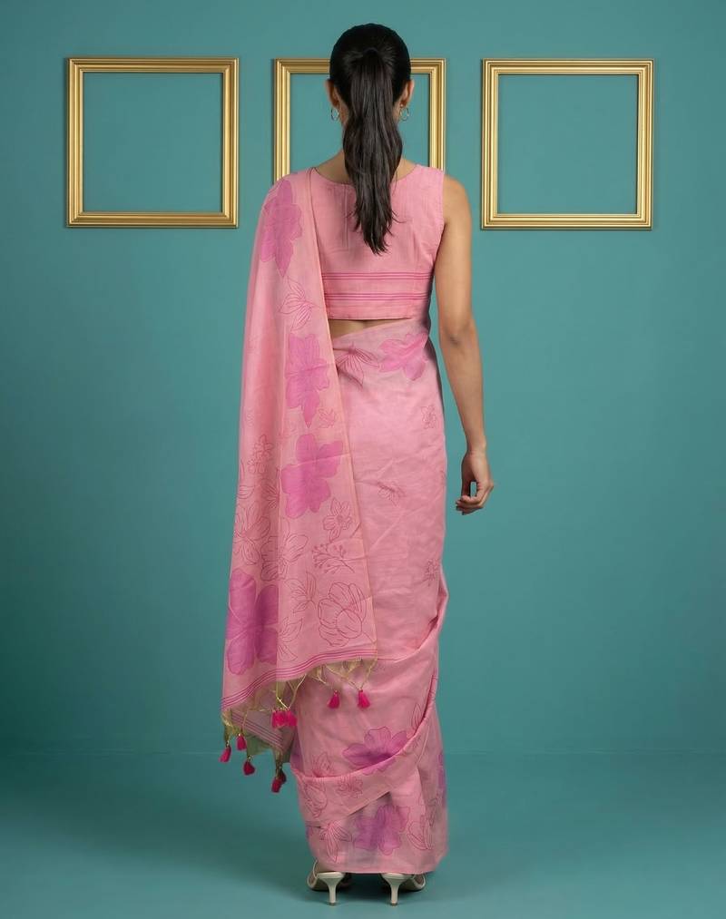 Pink muga cotton resham weaving pencil art saree with matching blouse piece