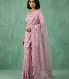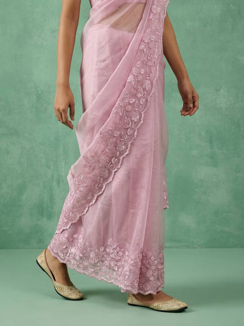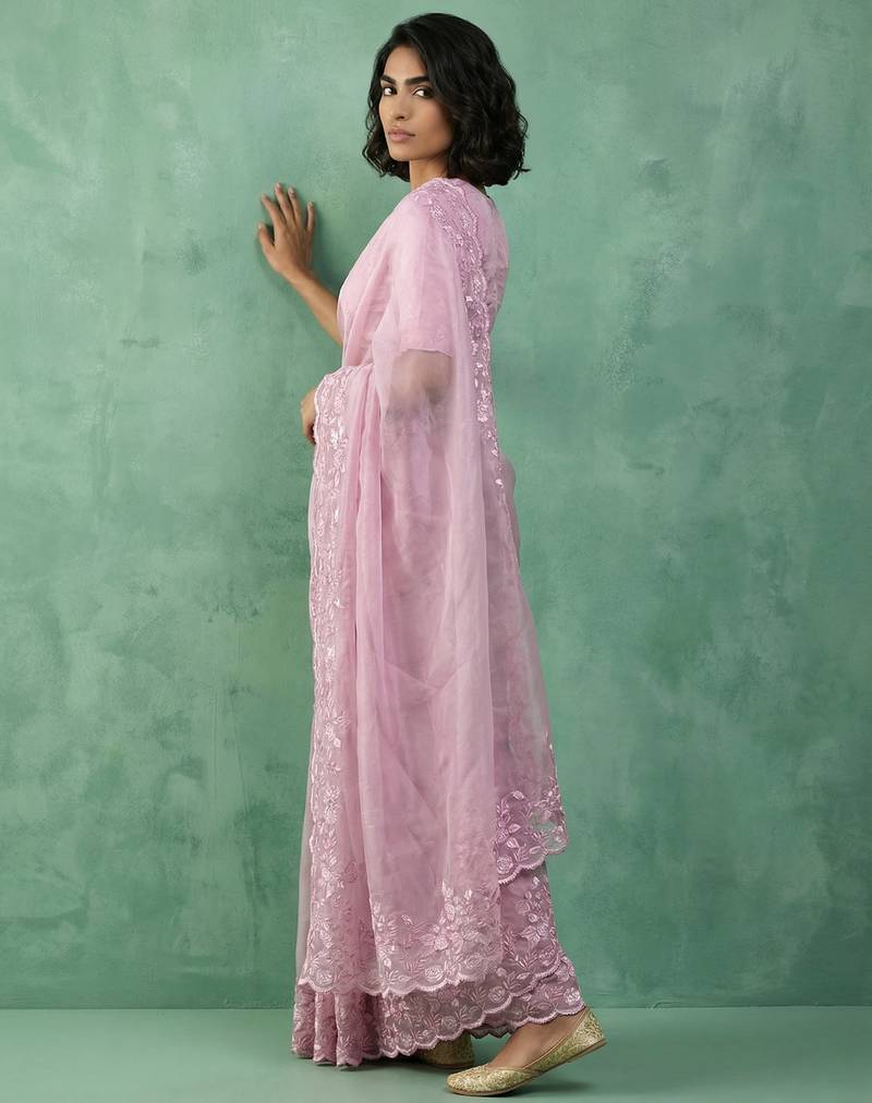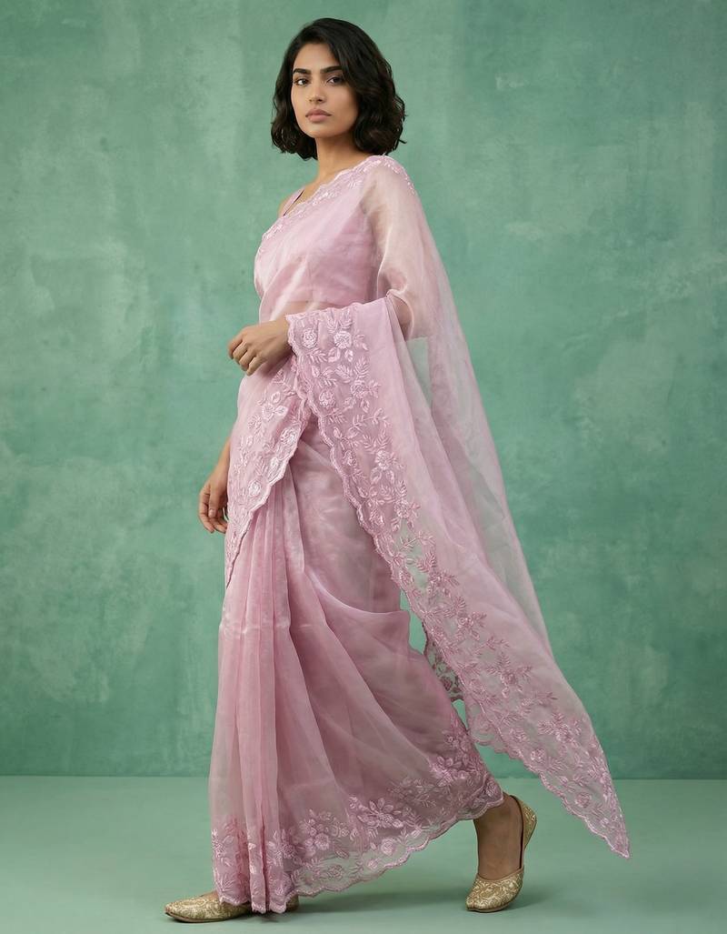 Pink thread embroidery floral border work organza elegant party wear style designer saree with blouse piece