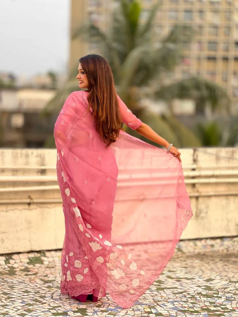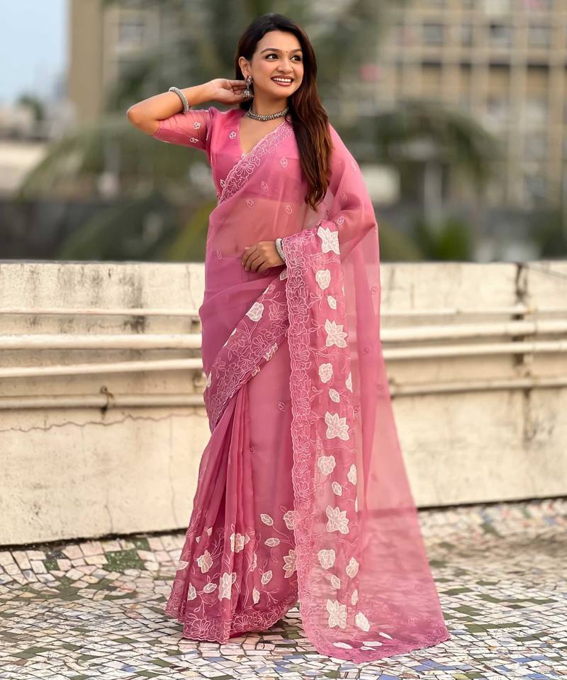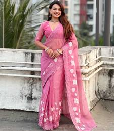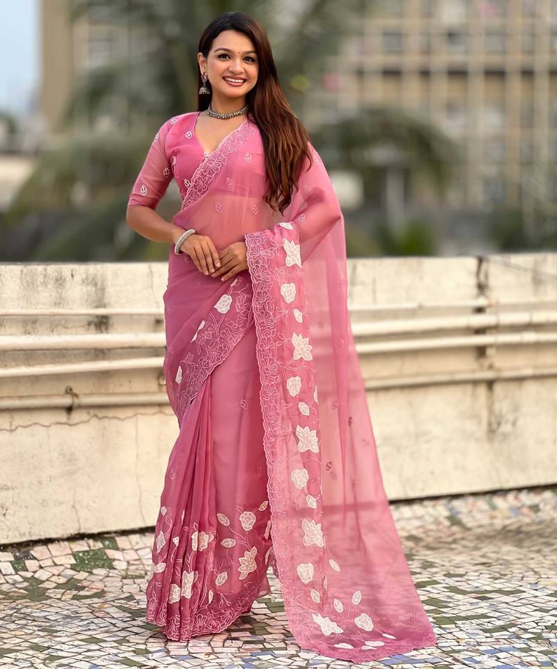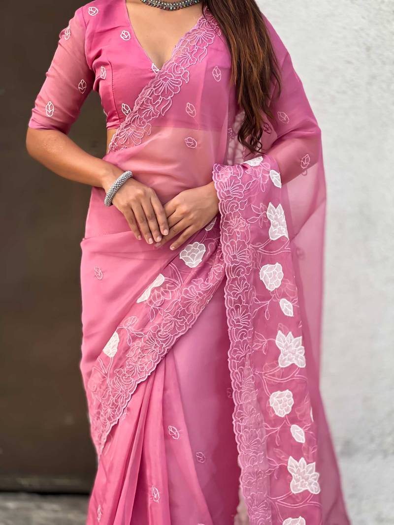 Pink thread embroidery floral work organza party wear elegant style designer saree with blouse piece
