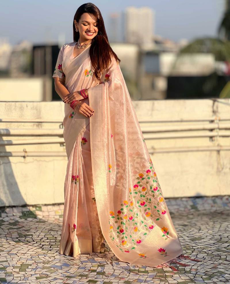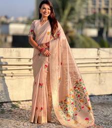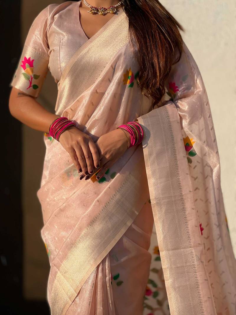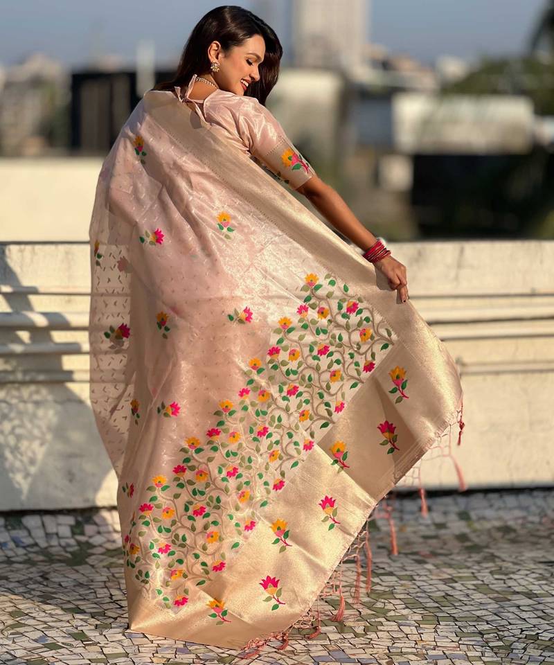 Pink with multicolor accents woven zari floral motifs work paithani style saree with blouse piece