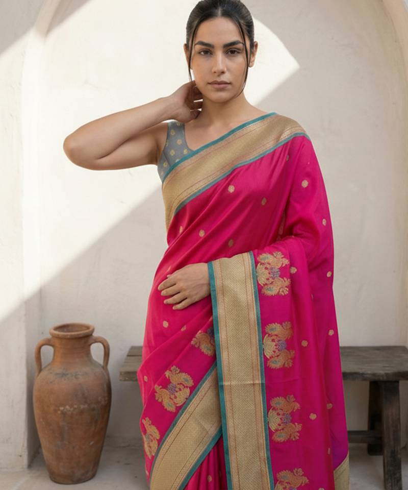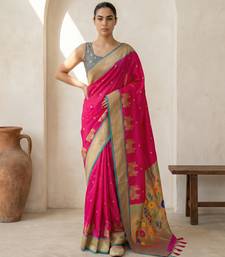 Pink woven zari buti & floral motifs work silk blend fabric traditional festive style
