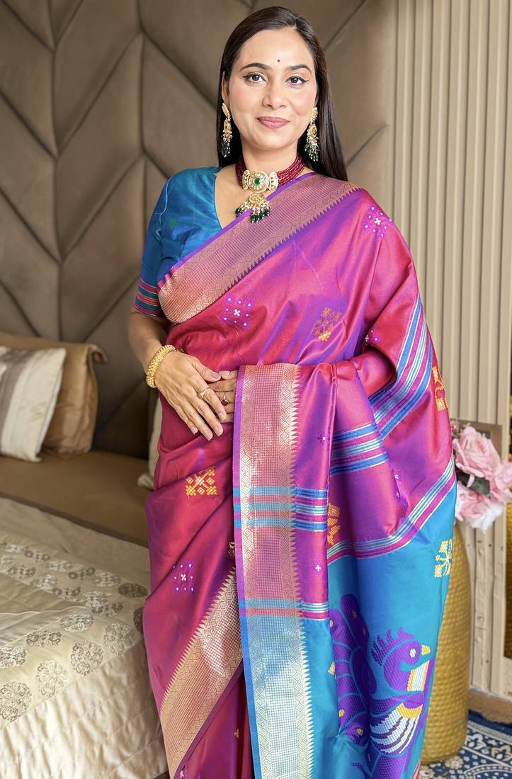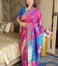 Pink woven zari buti & peacock pallu work silk blend fabric traditional festive style paithani style saree