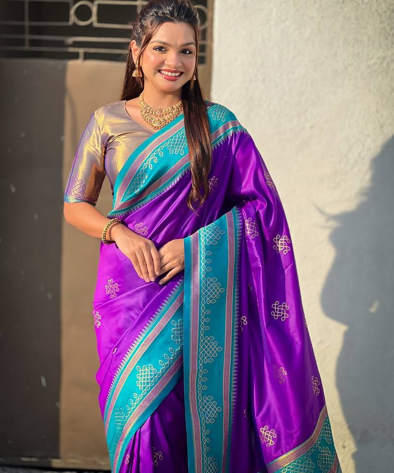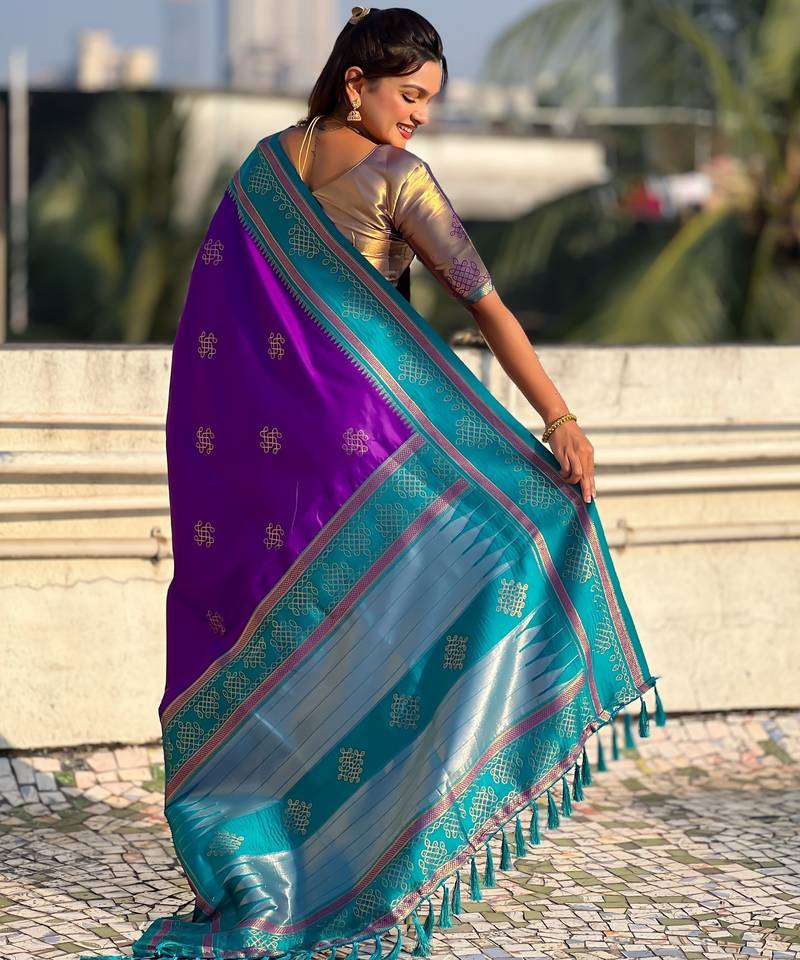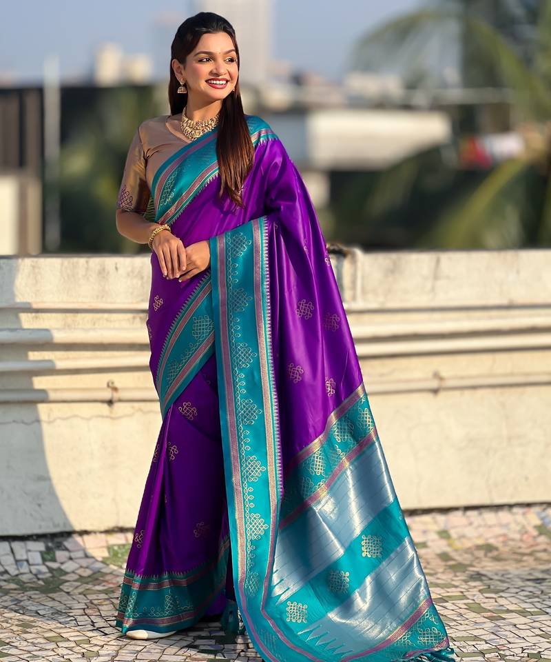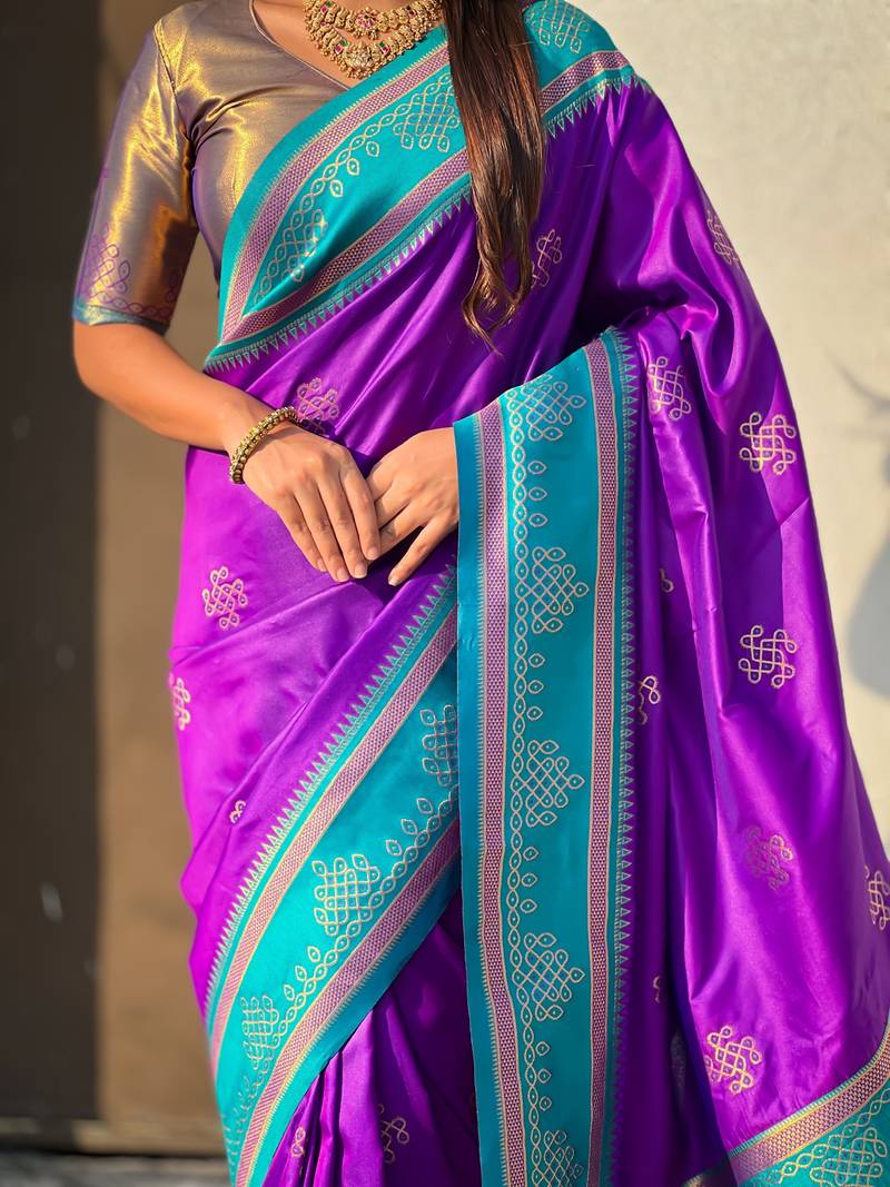| Product Name | Purple Border Traditional Butti & Geometric Zari Work Rich Woven Pallu Design | |