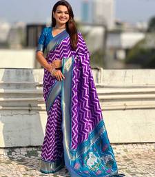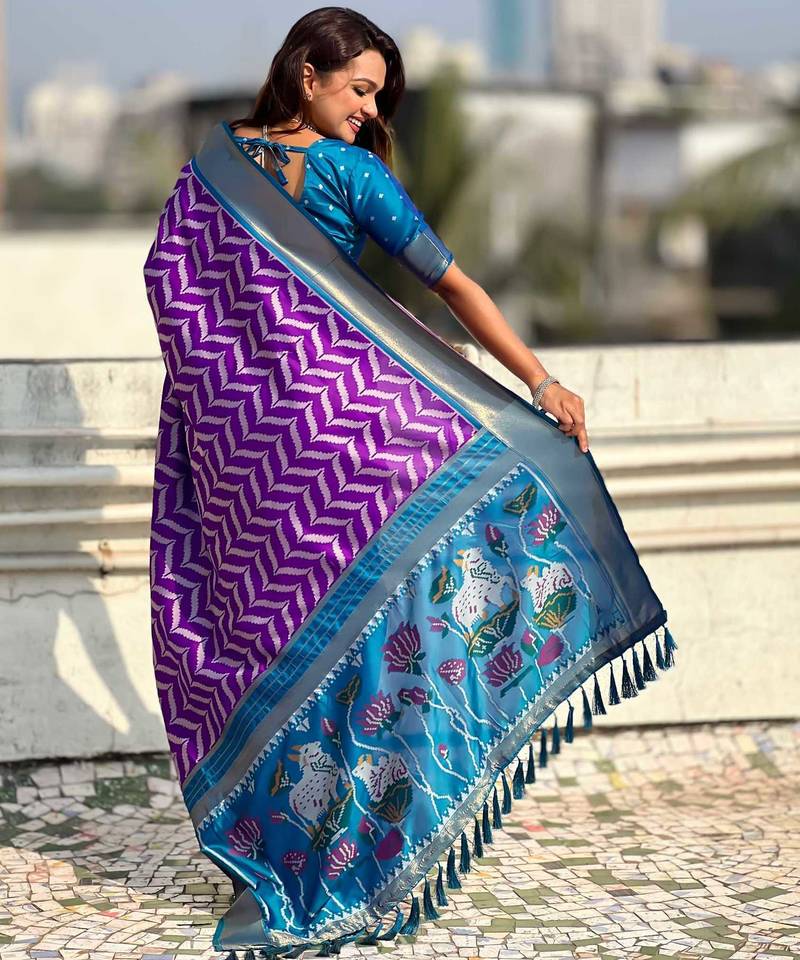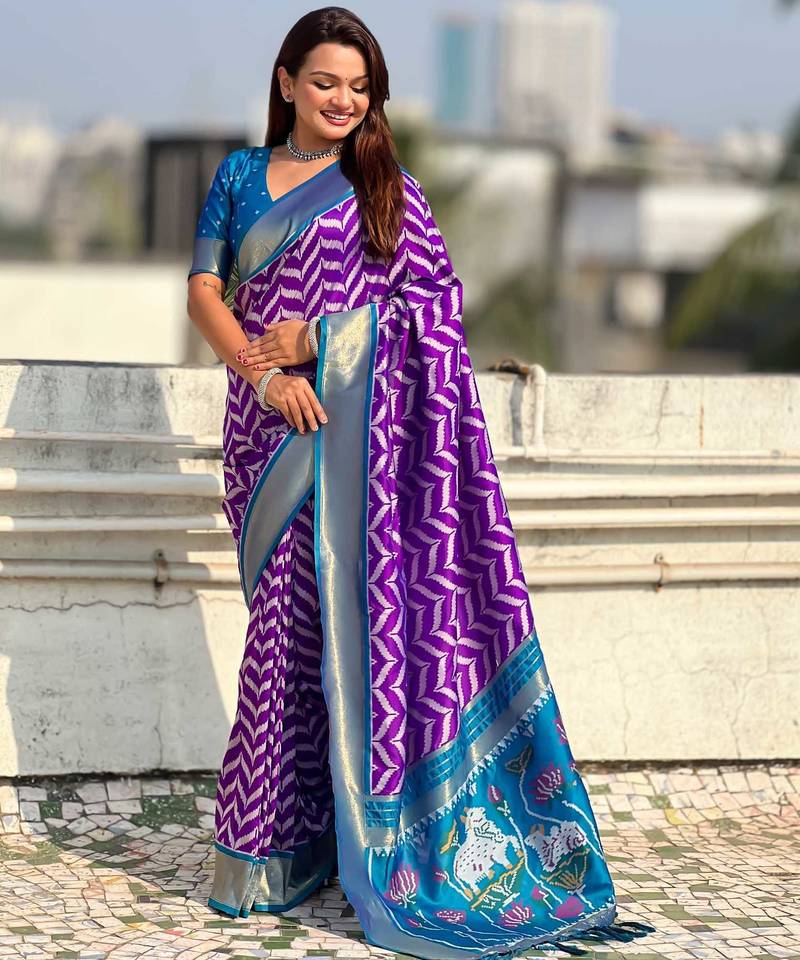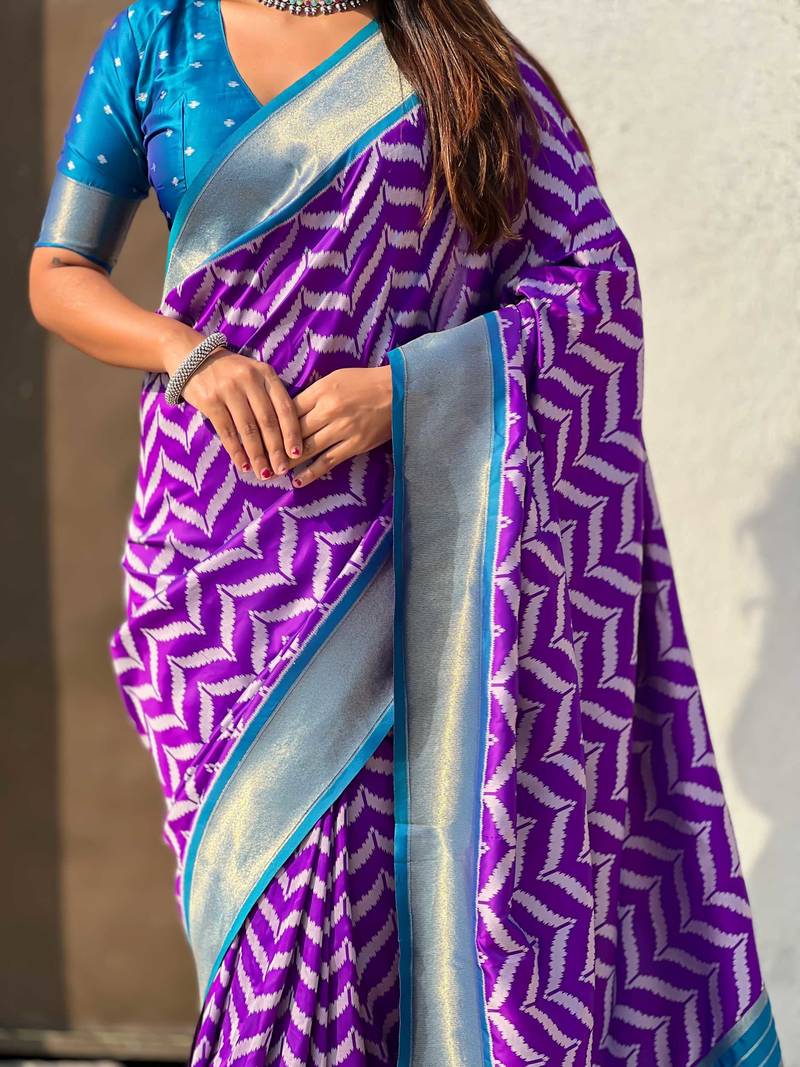 Purple contrast woven ikat patpurn with zari pallu work silk blend