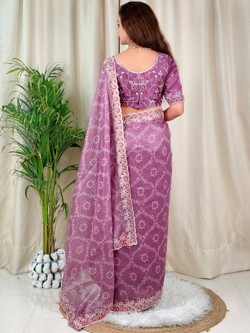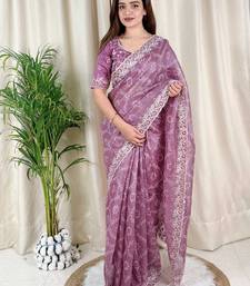 Purple cotton satin weaving zari border embroiderd saree with matching blouse piece