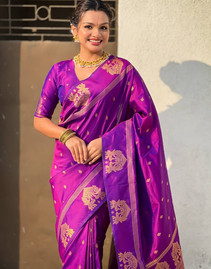 Purple silk blend saree with golden zari motifs & ripu woven pallu | traditional festive wear saree