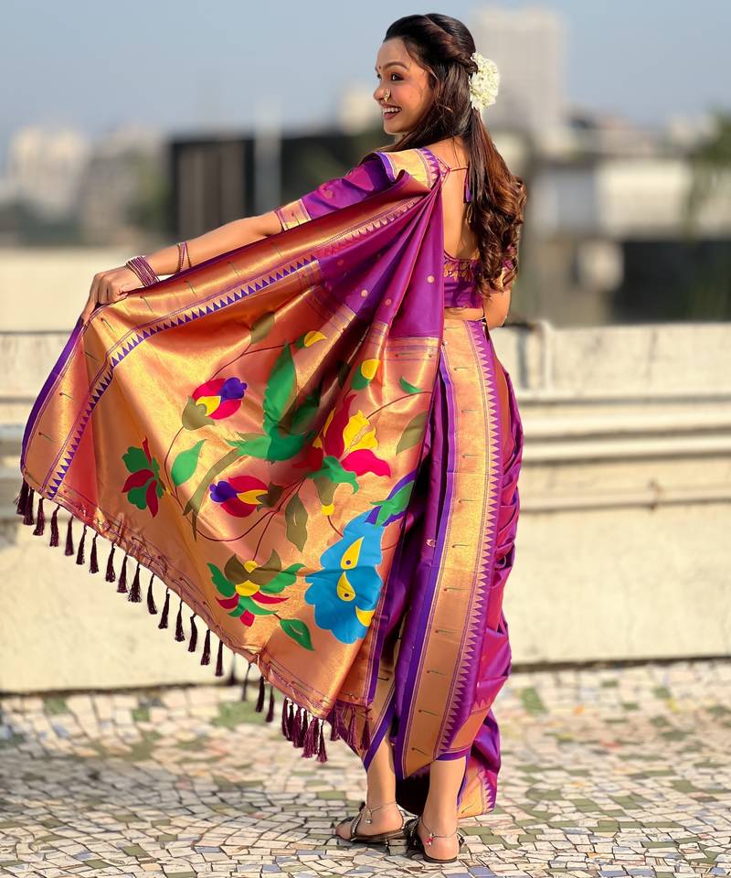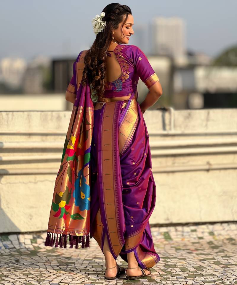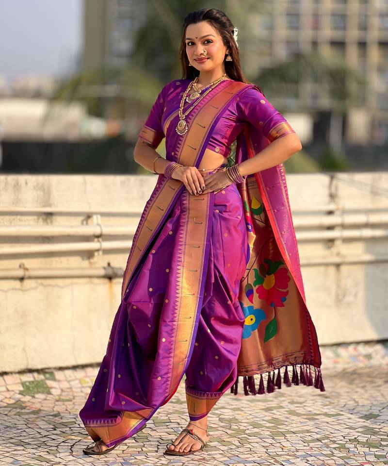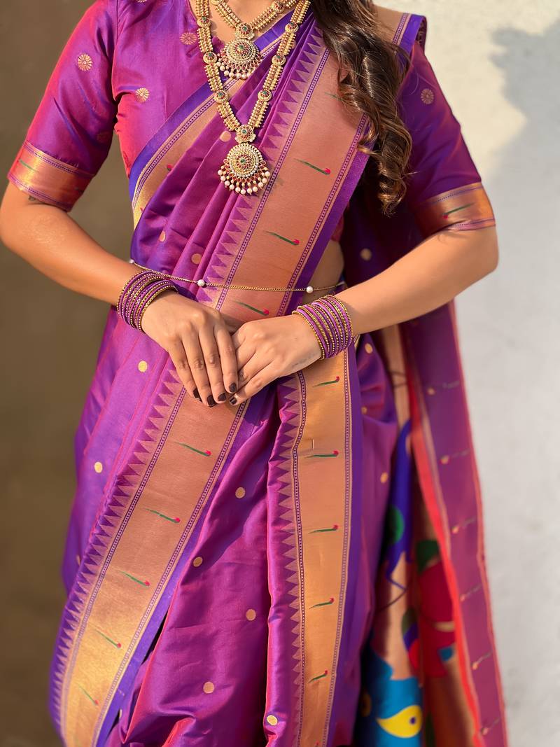 Purple soft silk paithani nauvari zari weaving saree with matching blouse piece