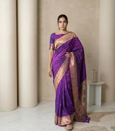 Purple with gold bpuder contrast traditional peacock & triangle motifs work silk blend fabric rich ethnic festive wear