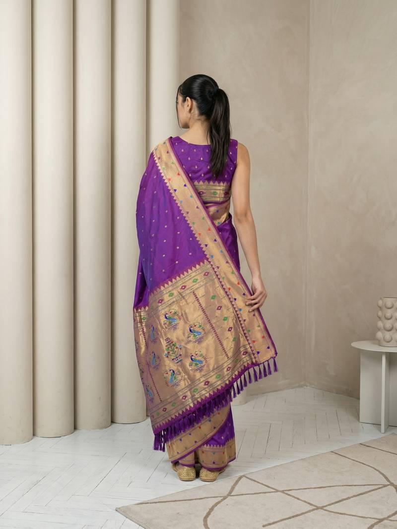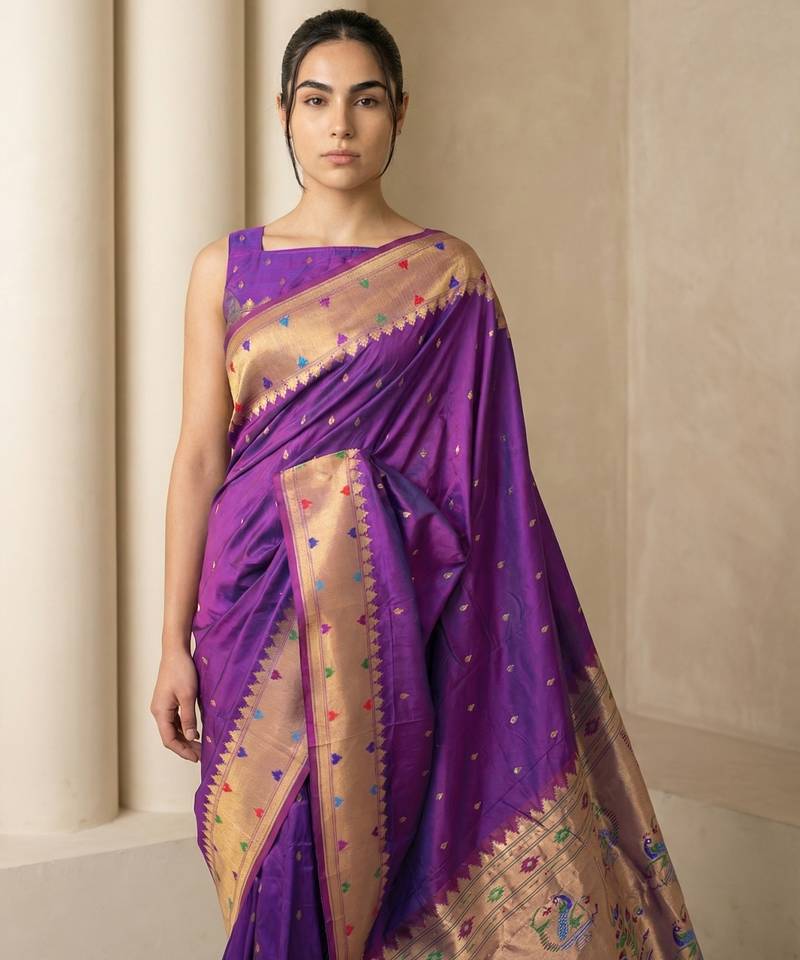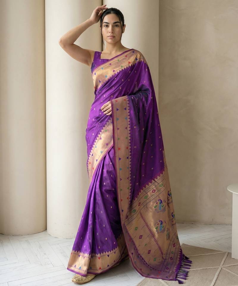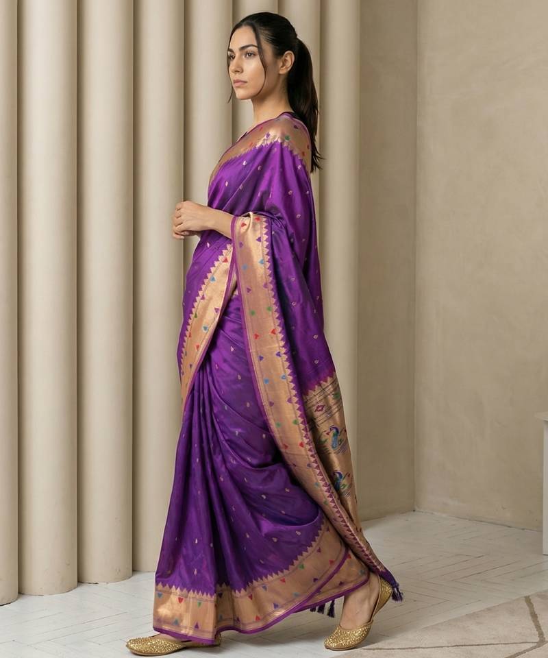 | Product Name | Purple With Gold Bpuder Contrast Traditional Peacock & Triangle Motifs Work Silk Blend Fabric Rich Ethnic Festive Wear | |