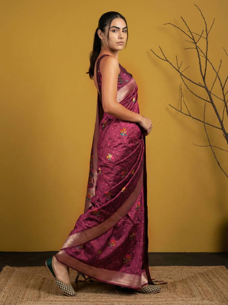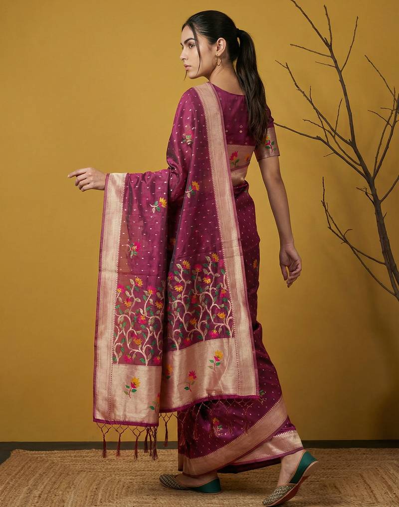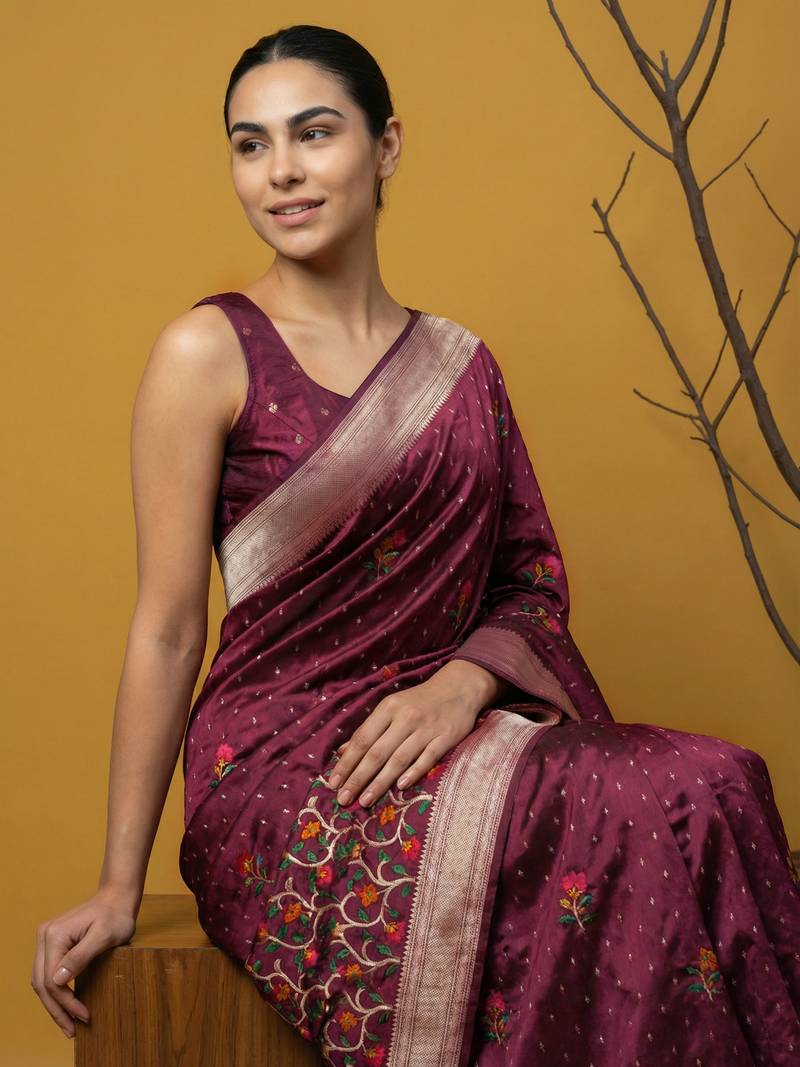 Purple with multicolor accents woven zari small buti & floral border work silk blend