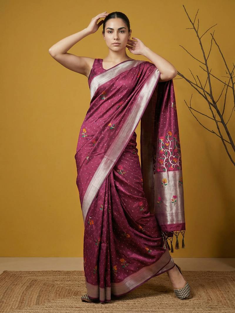 | Product Name | Purple With Multicolor Accents Woven Zari Small Buti & Floral Border Work Silk Blend | |