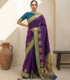 Purple woven zari buti & floral motifs work silk blend fabric traditional festive style