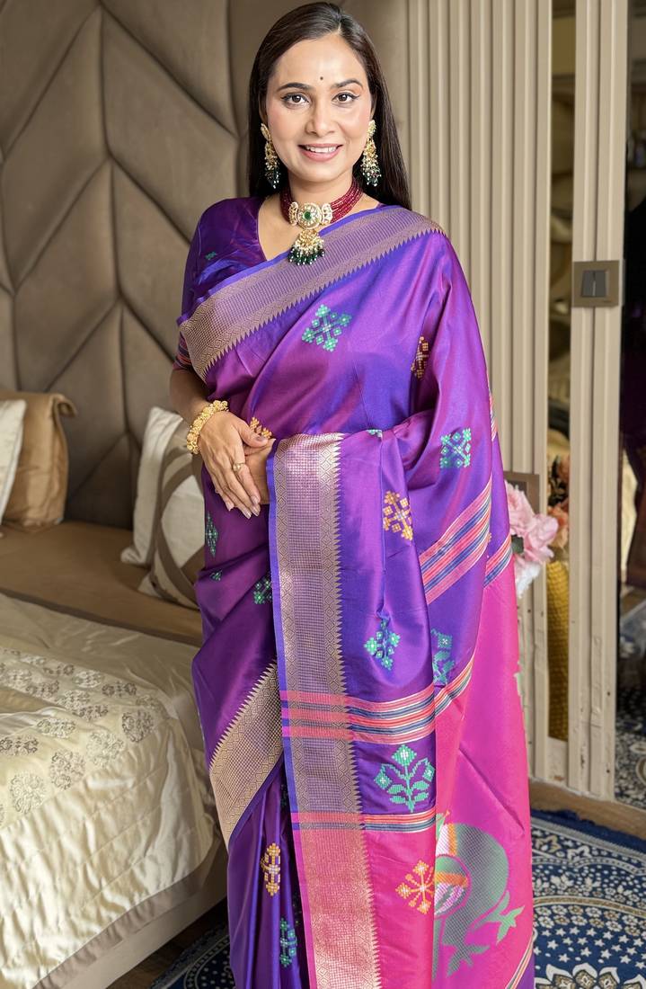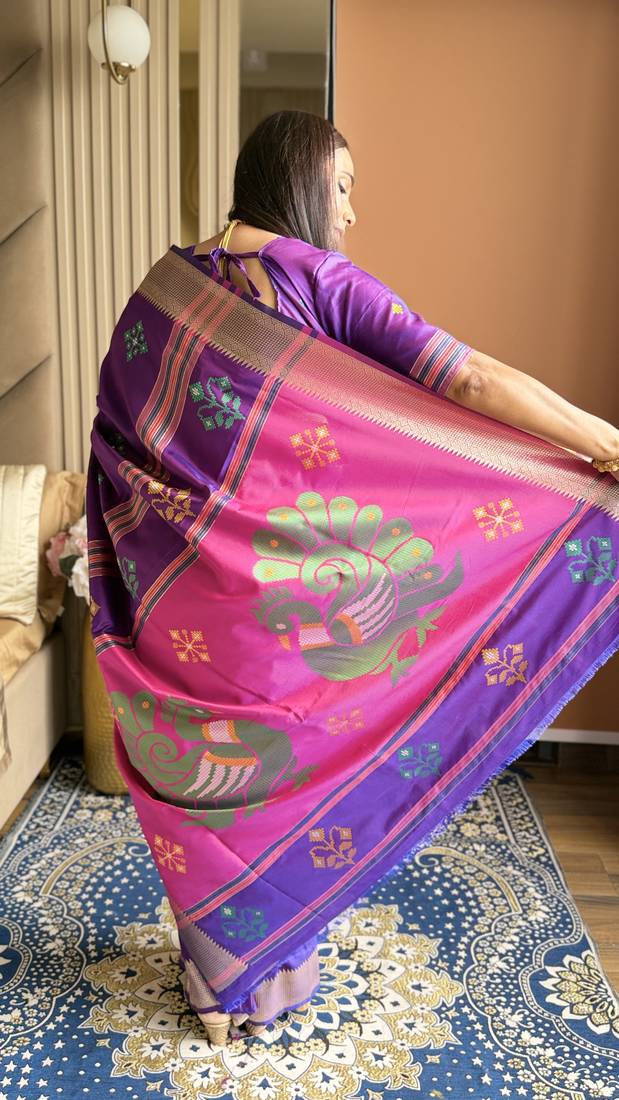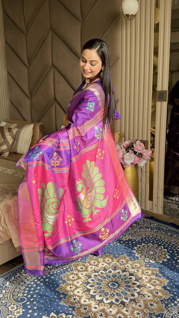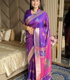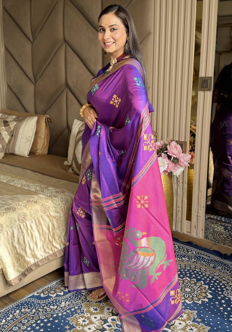 Purple woven zari buti & peacock pallu work silk blend fabric traditional festive style paithani style saree