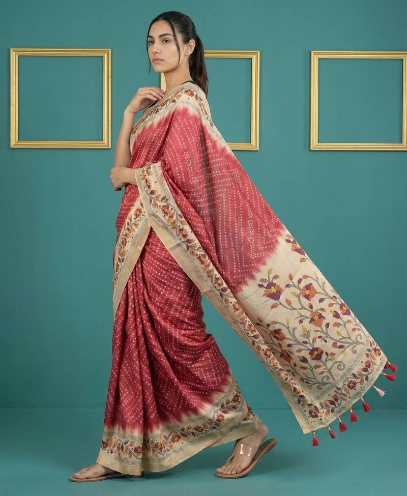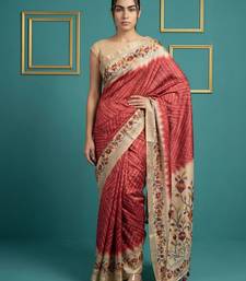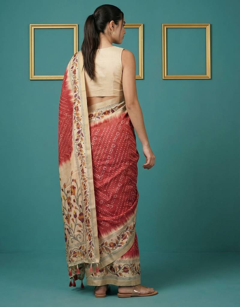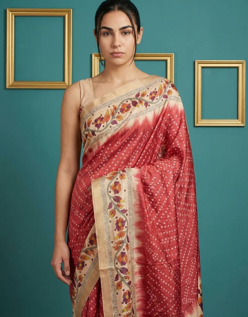 Red printed silk blend saree with beige floral border & designer pallu | traditional & festive wear saree