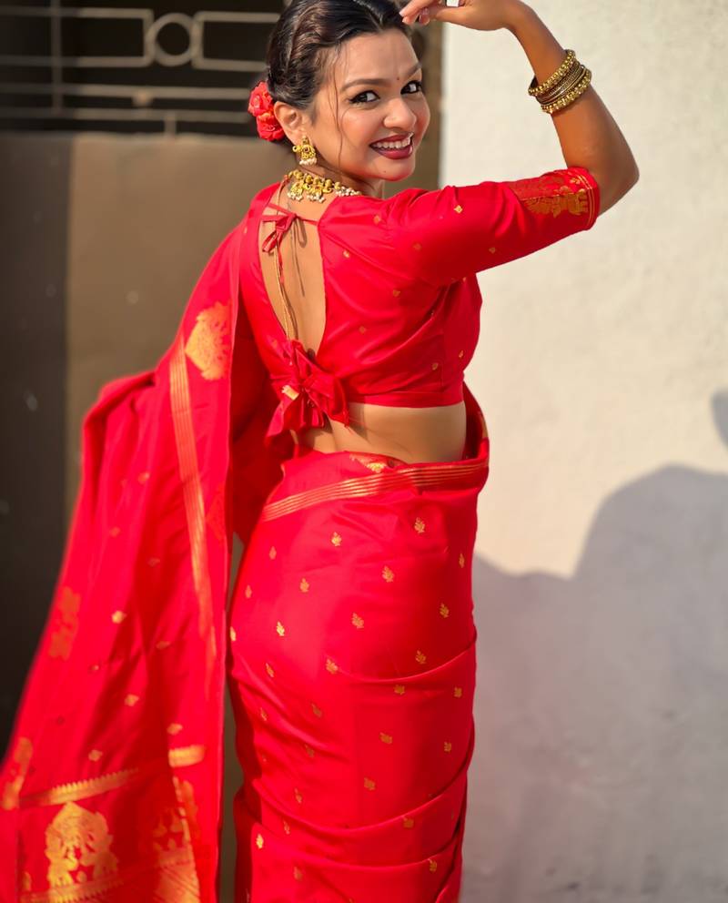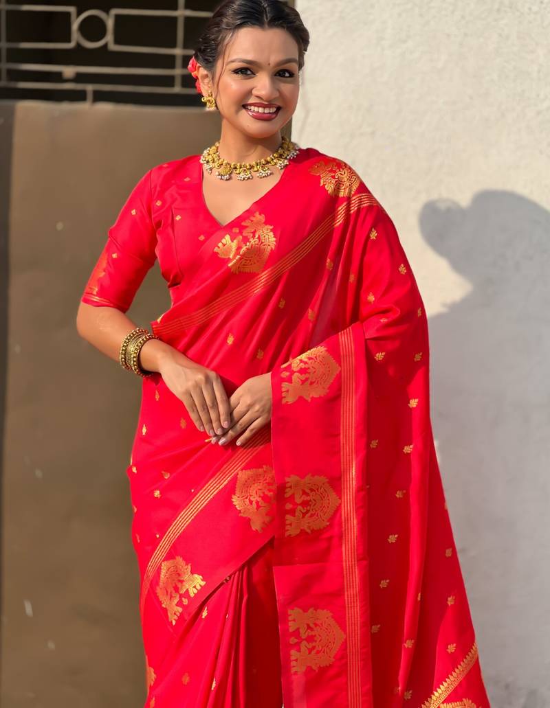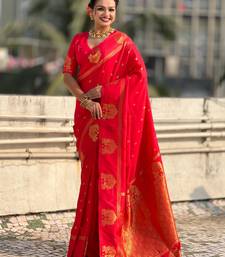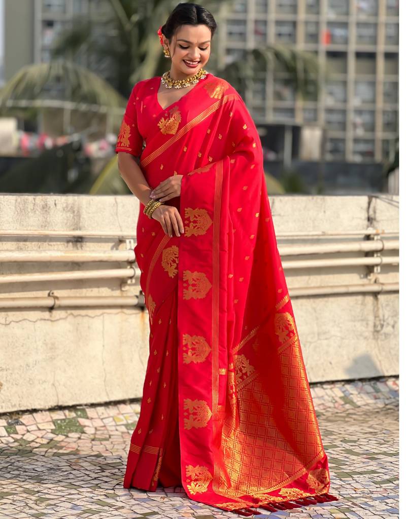 Red silk blend saree with golden zari motifs & rire woven pallu | traditional festive wear saree