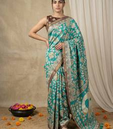 Sea green heavy woven zari floral & traditional motifs work silk blend fabric traditional grand festive